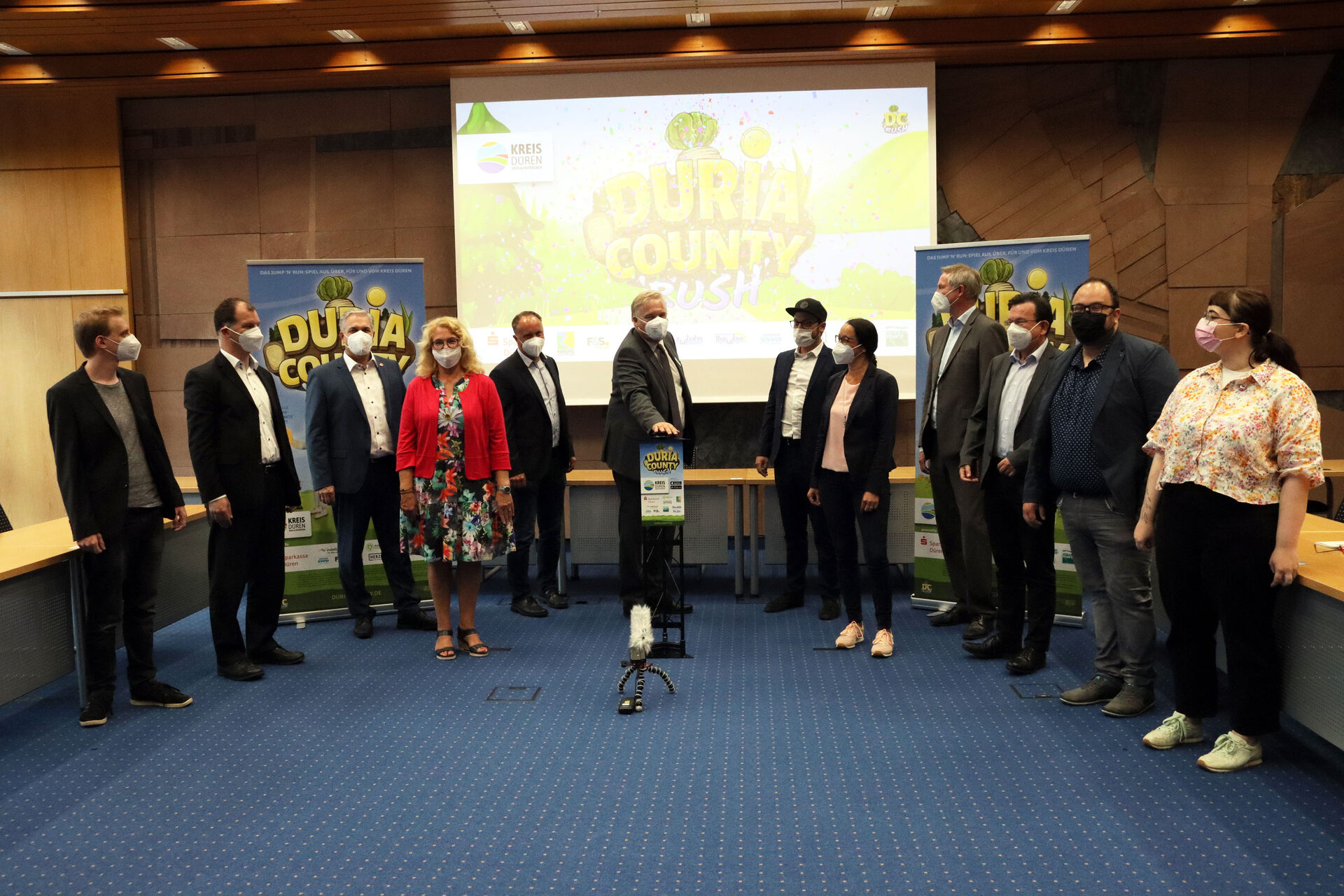 Startschuss für das Image-Spiel des Kreises Düren Duria County Rush mit allen Beteiligten und Sponsoren.
