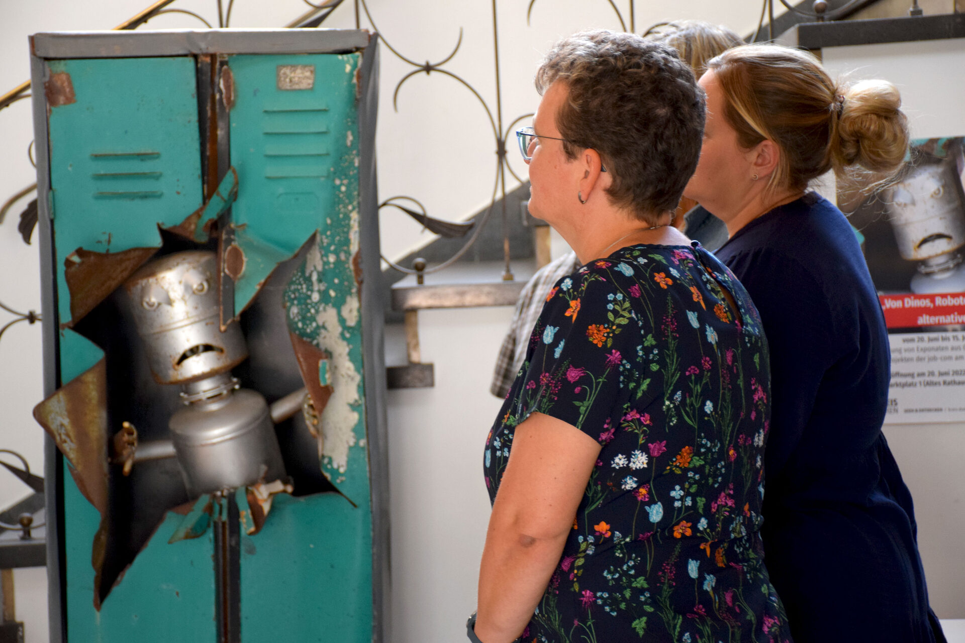 Über alle Etagen und auch den Außenbereich erstreckt sich die einzigartige Ausstellung "Von Dinos, Robotern und Marilyn – alternative Kunst-Objekte". Sie wird im Rahmen der Aktionswoche der kommunalen Jobcenter vom 20. bis 26. Juni gezeigt und bildet den Startschuss. Ziel der Aktionswoche ist es, die Arbeit der job-com vorzustellen und mit Bürgerinnen und Bürgern ins Gespräch zu kommen. Die auffälligen Kunstobjekte bieten da eine optimale Gelegenheit. "Teilweise wurde viele Jahre an den Kunstwerken gearbeitet", sagte Dezernentin Sybille Haußmann bei der offiziellen Eröffnung der Ausstellung am Montag (20. Juni). Und das sieht man auch. Viele Objekte sind sehr filigran gearbeitet und eines ist unterschiedlicher als das andere. Mal wurde Holz verwendet, mal Stahl, Stoff, Leinwand und Floristik. "Kunst ist eine Möglichkeit, sich zu erproben", so Haußmann weiter.