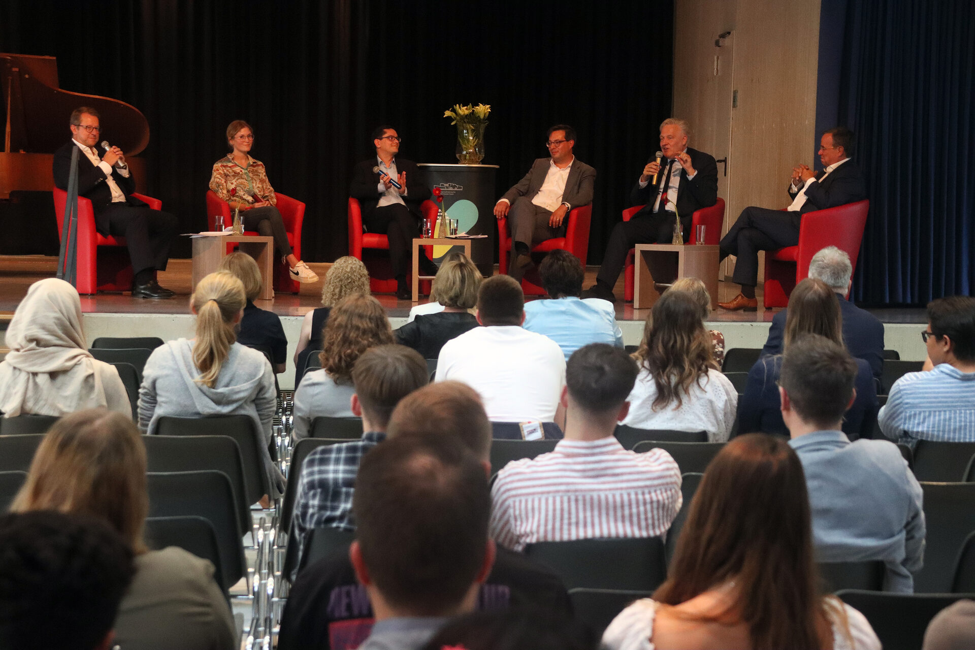 Einblicke in die Praxis bot eine vom aus Düren stammenden Kommunikationsberater Ulrich Stockheim geleiteten Talk-Runde, an der die Jule Pütz und Tilo Giese als ehemalige Schüler teilnahmen sowie Landrat Wolfgang Spelthahn, Armin Laschet und der Geschäftsführer der Vereinigten Industrieverbände von Düren, Jülich, Euskirchen & Umgebung, Dr. Stefan Cuypers. Es ging unter anderem um den Fachkräftemangel, die Bedeutung von Bildung, die Vereinbarkeit von Beruf und Familie oder die Integration von Fachkräften aus dem Ausland.