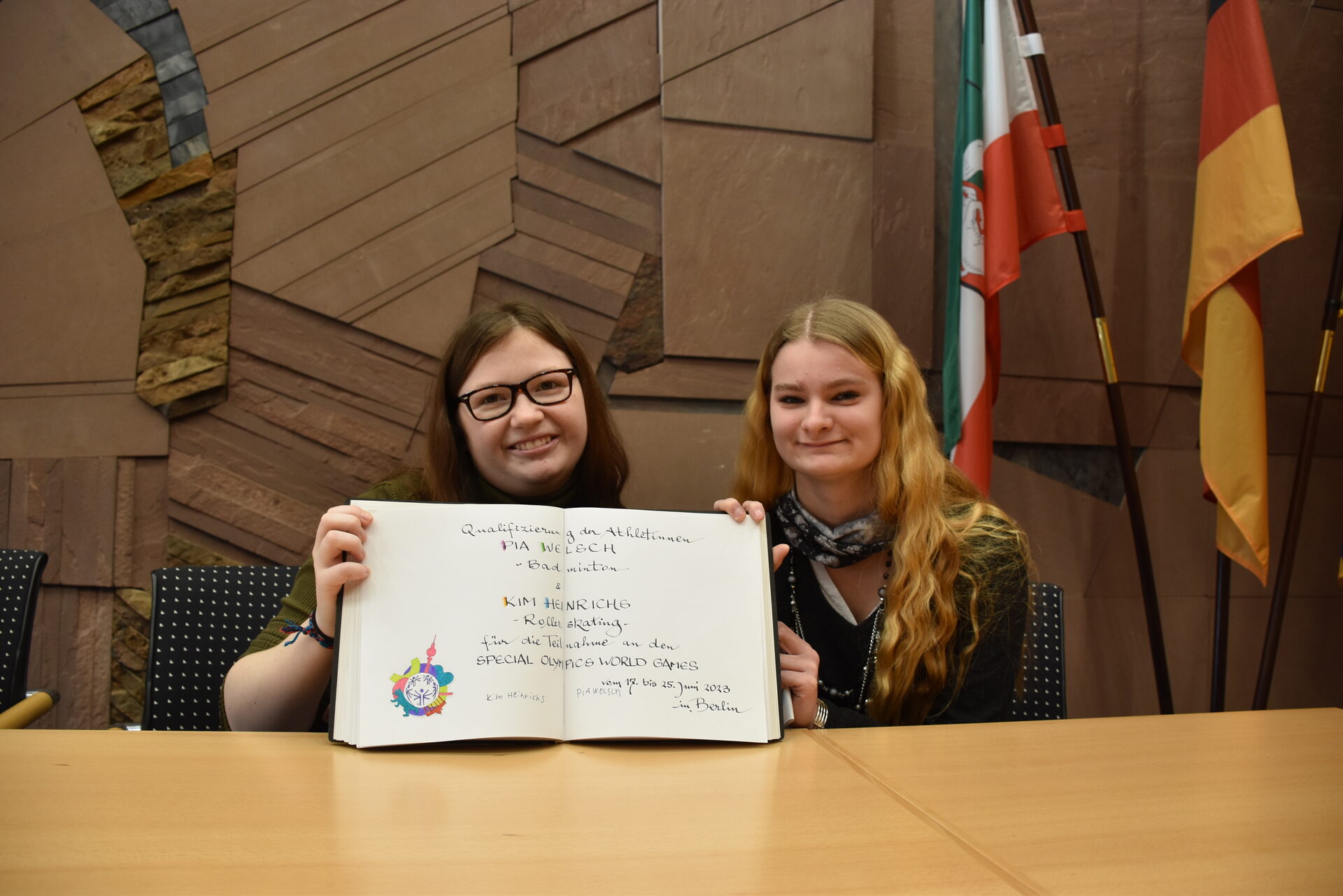Pia Welsch ist 18 Jahre alt und tritt im Einzel sowie gemischten Doppel im Badminton an. "Der Eintrag in das Goldene Buch ist wirklich etwas ganz Besonderes für mich. Ich freue mich sehr auf Berlin, wir werden unser Bestes geben", erzählt sie mit leuchtenden Augen. Neben ihr sitzt die 16-jährige Kim Heinrichs mit einem freudigen Lächeln im Gesicht. "Das Ganze ist jetzt schon ein so großer Erfolg, mit dem ich niemals gerechnet hätte. Dass wir uns in das Goldene Buch des Kreises Düren eintragen durften, ist toll. So etwas erlebt man nur einmal im Leben."