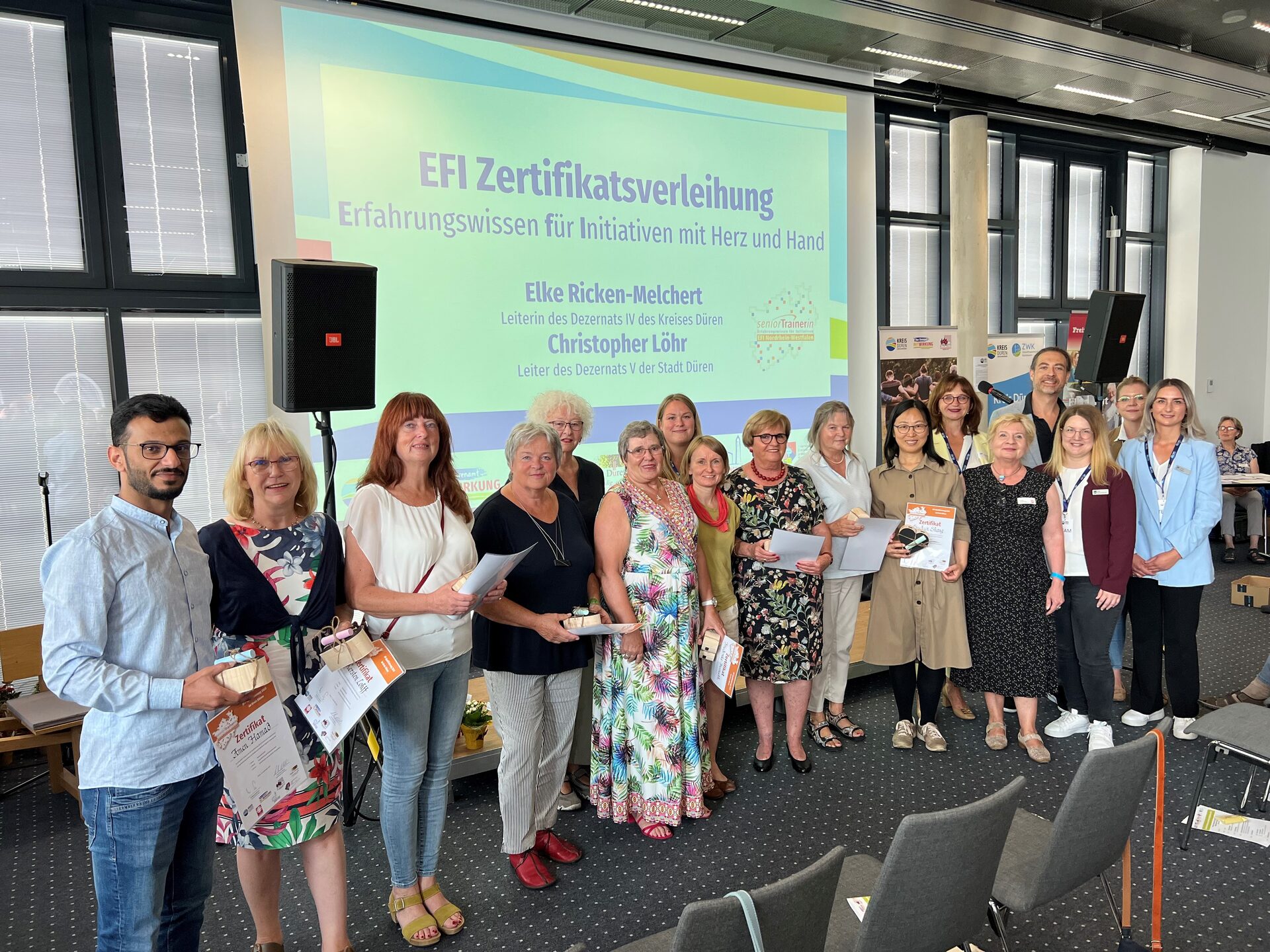 Zehn neu ausgebildete Senior-Trainerinnen und -Trainer erhielten beim ersten "Markt der Möglichkeiten" ihr Zertifikat für "Erfahrungswissen für Initiativen", kurz EFI. 230 Menschen aus dem Kreisgebiet besuchten den "Markt der Möglichkeiten", der die Bedeutung und Vielfalt von Engagement im Kreis Düren sichtbar gemacht hat.