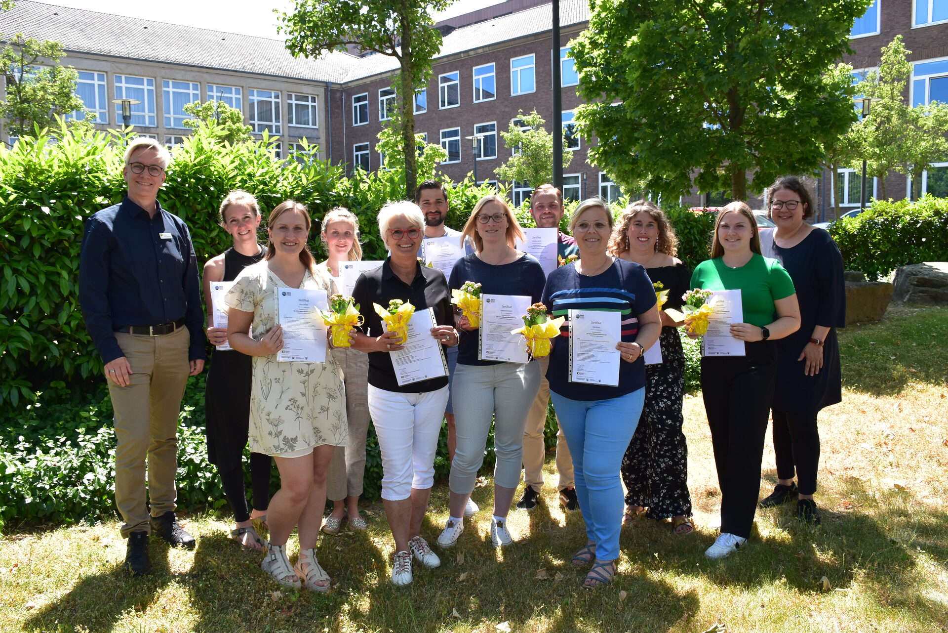 Die Erzieherinnen, Erzieher und Organisatoren freuen sich über den erfolgreichen Abschluss der Fortbildungsreihe "Sprachliche Bildung im Elementarbereich". Sie erhielten von Claudia Berschbach, Leitung des Kommunalen Integrationszentrums des Kreises Düren, (1.v.l.) ein entsprechendes Zertifikat.