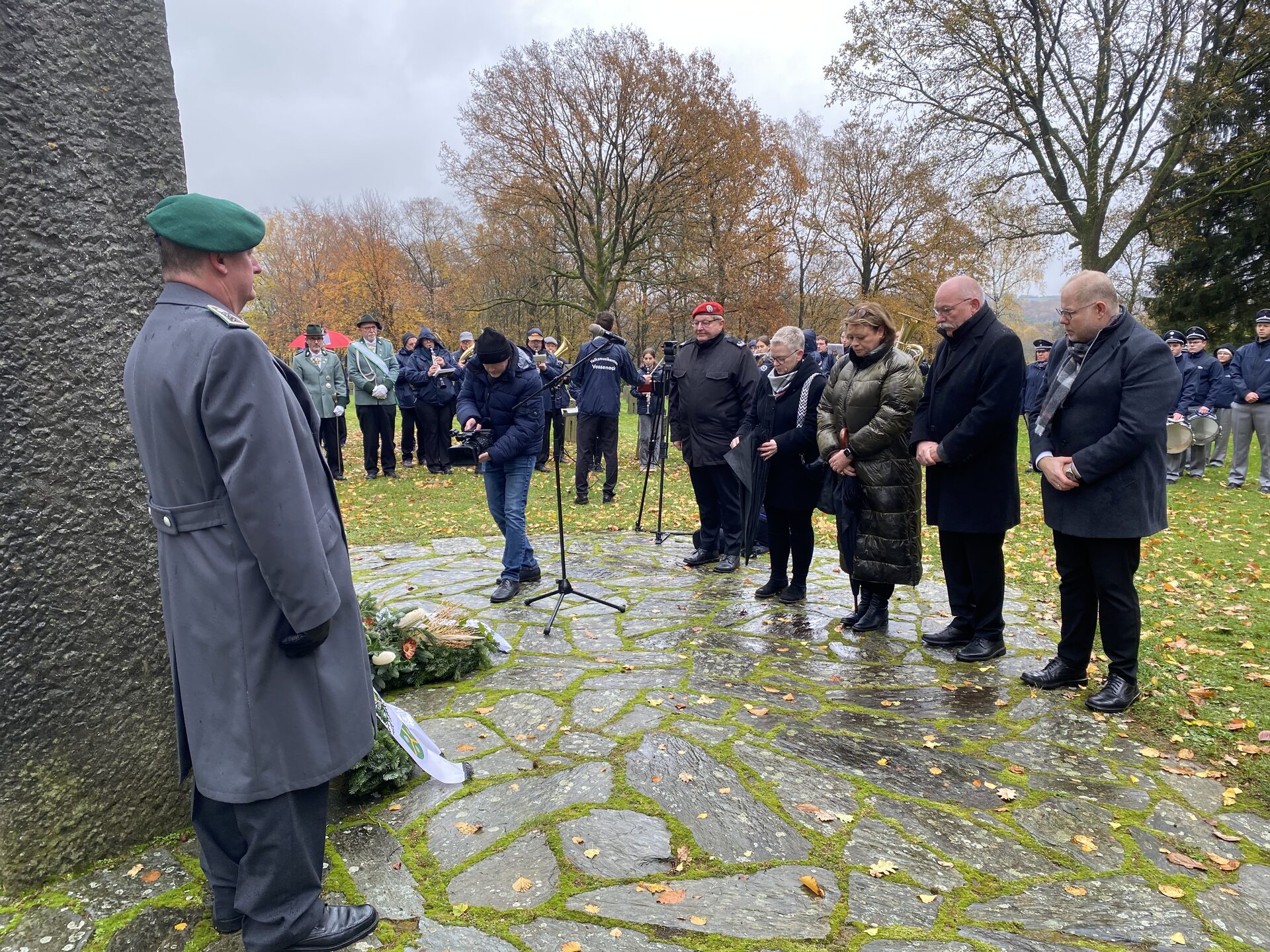 Peter Kaptain legte als stellvertretender Vorsitzender des Kreisverbandes Düren des Volksbundes Deutsche Kriegsgräberfürsorge gemeinsam mit Helga Conzen als stellvertretende Landrätin des Kreises Düren, Hürtgenwalds Bürgermeister Stephan Cranen, Hürtgens Ortsvorsteherin Iris Hürtgen und Oberstleutnant Dr. Uwe Laurien als Reservist der Bundeswehr die Kränze nieder.