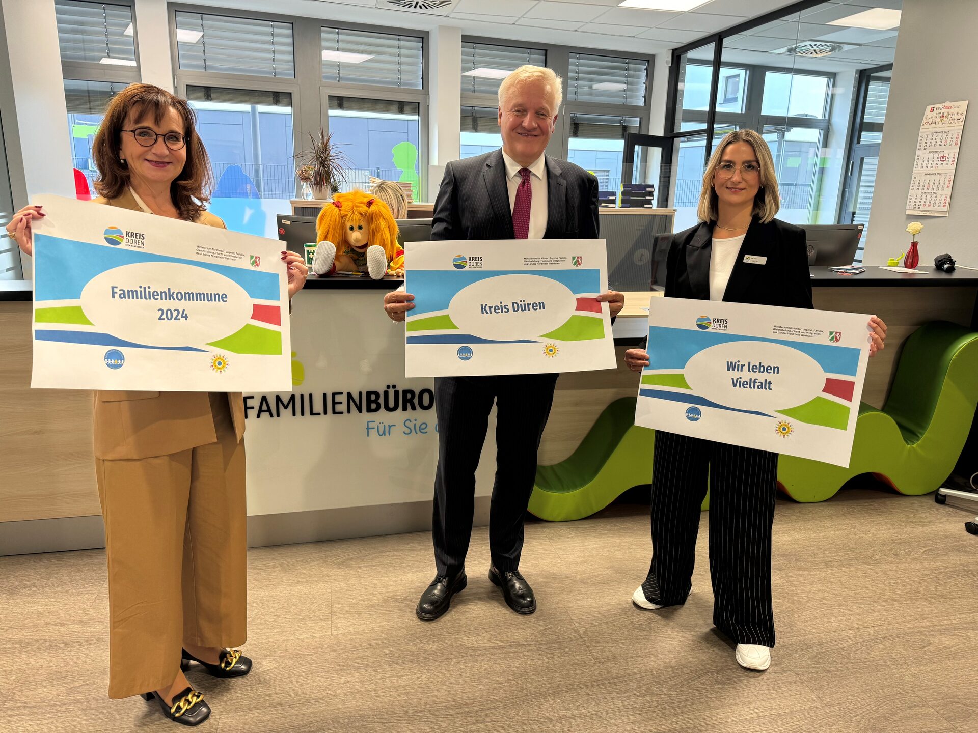 Der Kreis Düren darf sich nun „Familienkommune 2024“ bezeichnen und hat im Landeswettbewerb gewonnen. Das freut Dezernentin Elke-Ricken Melchert, Landrat Wolfgang Spelthahn und Carolin Küpper, Amtsleiterin für Generationen, Demografie, Inklusion und Sozialplanung (v.l.), besonders.