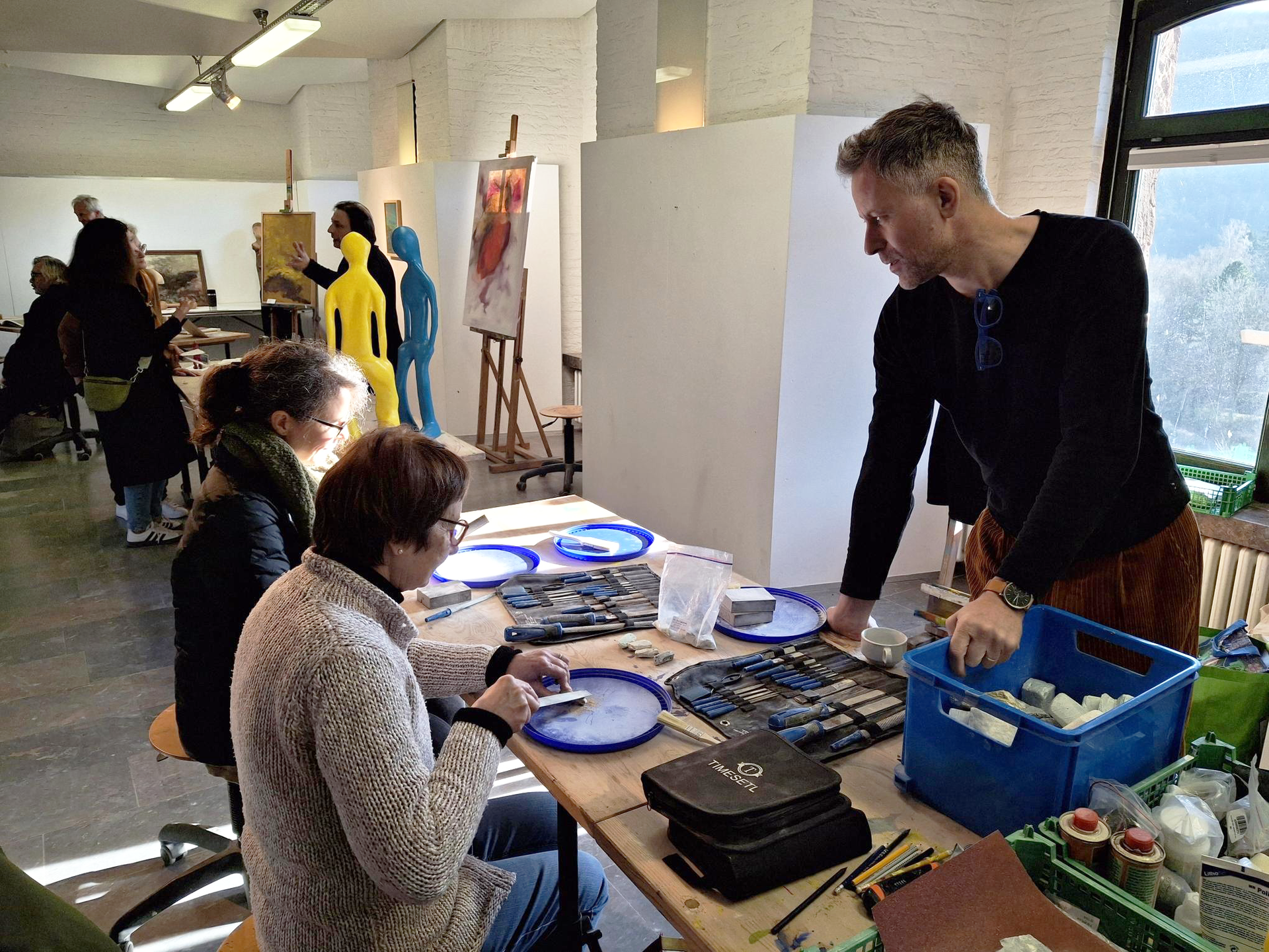 Am Nachmittag verwandelte sich die Burg in ein lebendiges Atelier. Bei verschiedenen Mitmachangeboten konnten die Besucher selbst aktiv werden. Unter Anleitung erfahrener Dozenten und Dozentinnen der Akademie tauchten Interessierte in die Welt des Papierschöpfens, der Zeichnung, Der Fotografie und der Bildhauerei ein.