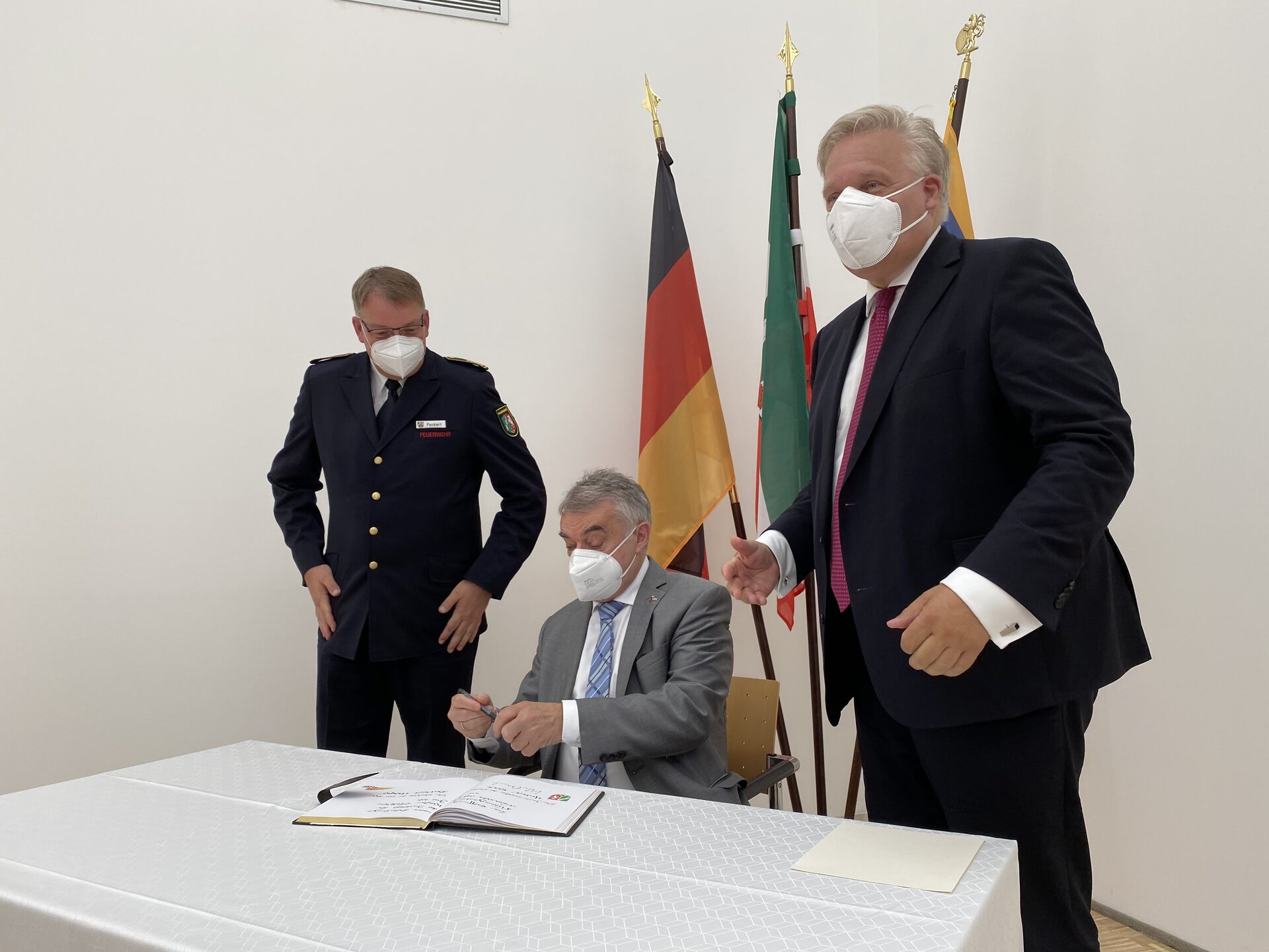Einer der jüngsten Einträge ins Goldene Buch des Kreises Düren stammt von NRW-Innenminister Herbert Reul und Berthold Penkert, Direktor des Instituts der Feuerwehr, kurz IdF. Denn am 28. Juni 2021 ist das neue Schulungs- und Trainingszentrum für Feuerwehr-Führungskräfte auf dem Campus Stockheim eröffnet worden. Bisher wurde diese Ausbildung NRW-weit nur in Münster angeboten. Träger des neuen Ausbildungszentrums ist das Institut der Feuerwehr (IdF), eine Einrichtung des Landes NRW.