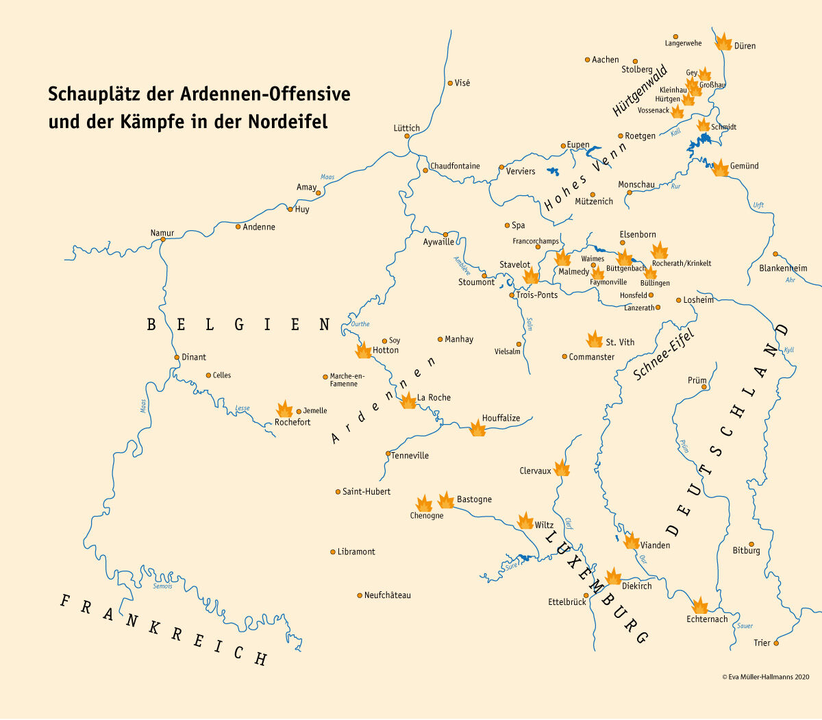Ebenso schlimm sah es jenseits der Grenze in Belgien aus, wo die militärisch chancenlose Ardennen-Offensive von Wehrmacht und Waffen-SS gleichfalls Tod, Elend und Zerstörung brachte. Städte und Dörfer wie St. Vith, Malmedy, Bütgenbach, Rocherath, Büllingen, Vianden, Houffalize, Bastogne, Wiltz, La Roche, Hotton, Faymonville, Chenogne oder Jemelle wurden weitgehend oder vollkommen zerstört. Tausende Soldaten und auch zahlreiche Zivilpersonen starben beiderseits der Grenze in der Endphase des Krieges.