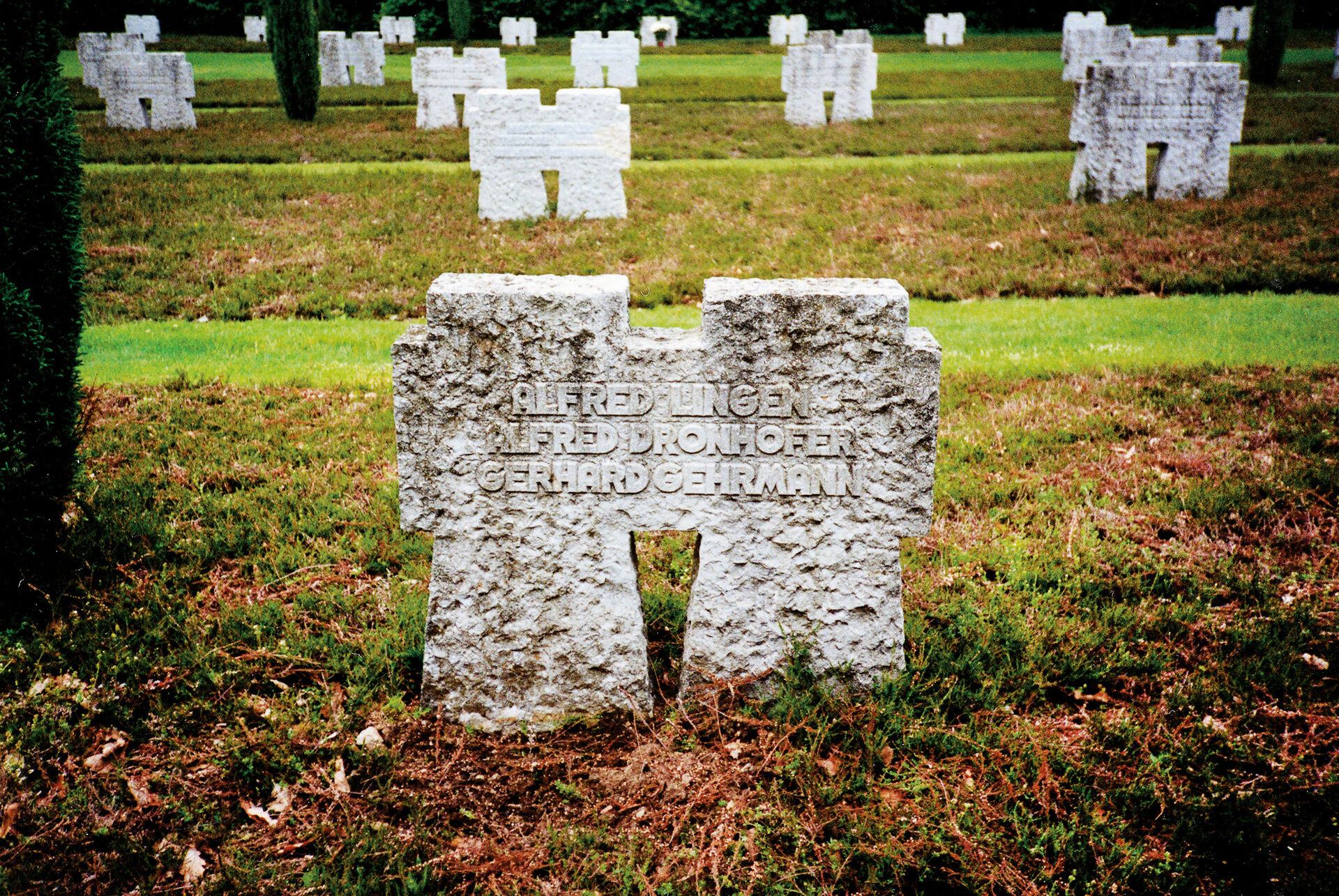 Hauptfeldwebel Josef Prümm aus Eilendorf sandte 1971 das von ihm verfasste Gedicht „Das Kreuz im Hürtgenwald“ an den Volksbund Deutsche Kriegsgräberfürsorge. Unproblematisch ist der Text nicht, weil es den Kriegstod zum „Opfer für das Vaterland“ verklärt. Der Volksbund sah auch von einer weiteren Nutzung des Gedichtes ab. 1999 ließ der Friedhofswärter es in eine Metallplatte gravieren, auf einem ehemaligen Treppenstein befestigen und am äußersten Rand der Kriegsgräberstätte aufstellen.