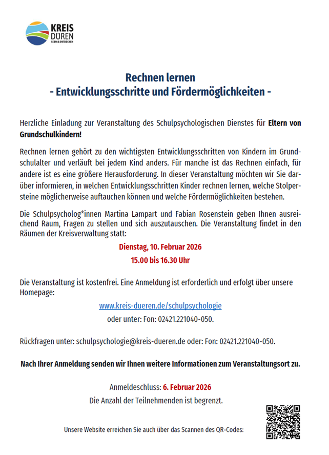 Rechnen lernen - Entwicklungsschritte und Fördermöglichkeiten - Veranstaltung für Eltern von Grundschulkindern