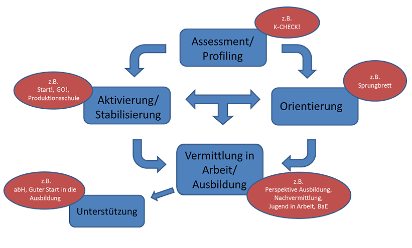 Die Integrationsfachkräfte der job-com für Jugendliche agieren in einem Netzwerk von Partnern und Unterstützungsleistungen und entwickeln gemeinsam sog. Förderketten, die Sie im Rahmen unseres "Integrationsmodells U 25" zielgerichtet Schritt für Schritt an den Arbeitsmarkt heranführen.