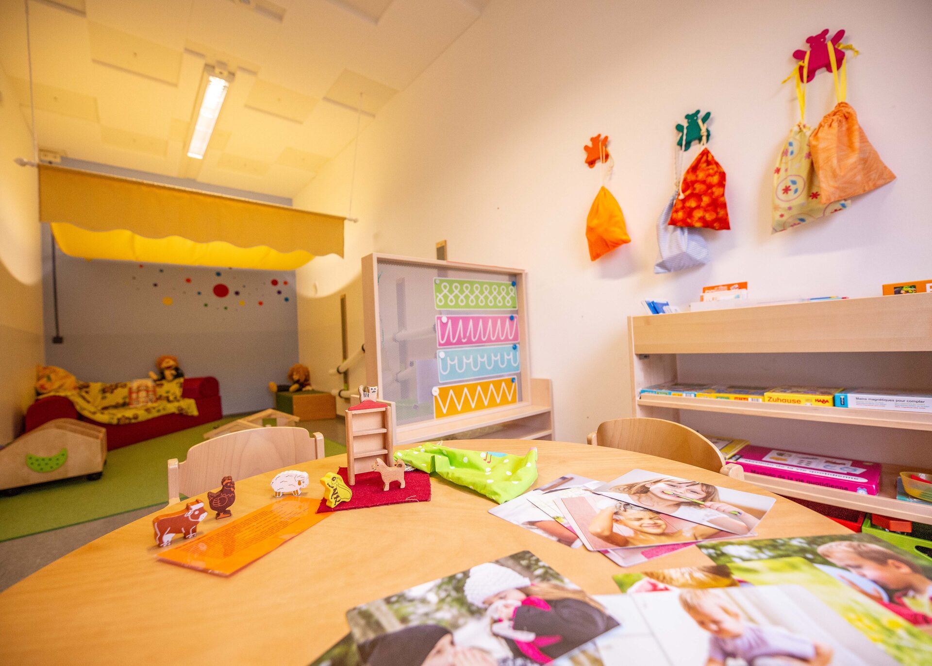 Eine bunte Auswahl an Konstruktionsmaterial, Gemeinschaftsspielen, Puzzeln und Büchern zur Beschäftigung wird allen Kindern im Freispiel angeboten.