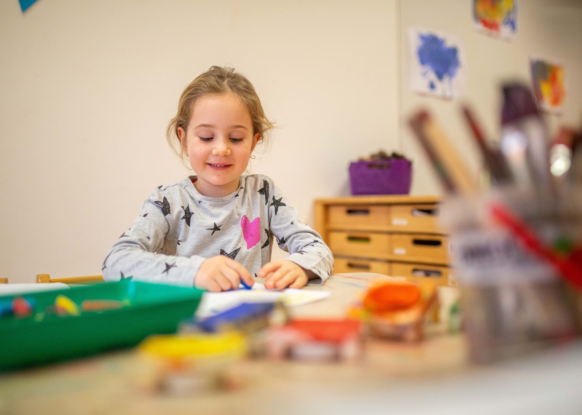 Kreativecken motivieren die Gestaltungslust unserer Kinder. Kleber, Stifte und unterschiedliches Papier gehören zum Standartangebot zur altersentsprechenden, freien Verfügung.