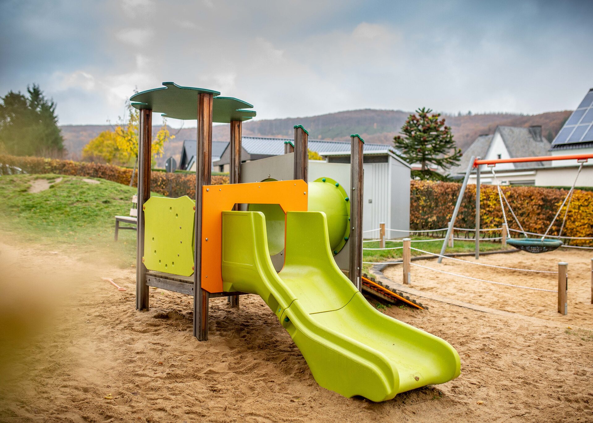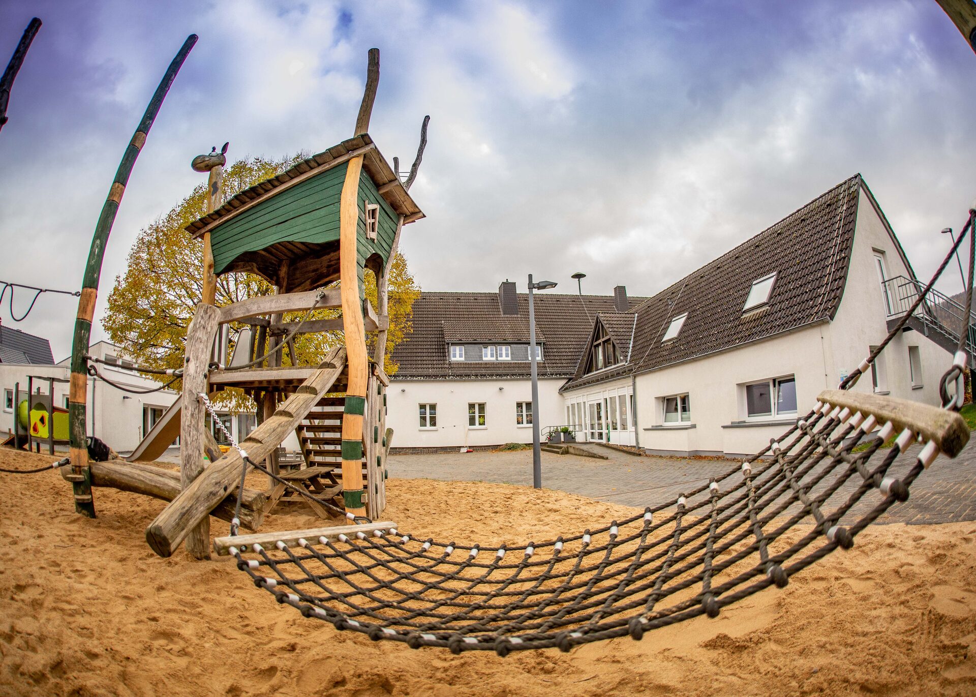 Die Einrichtung ist eingebettet in ein großzügiges Außengelände. In unserem großen Sandspielbereich steht eine Seilkletteranlage mit Rutsche, Hängematte und Türmen. Nicht nur für unsere Jüngsten leuchtet zusätzlich ein grünes Kletter- und Rutschspielgerät. Zum Schaukeln und Ruhen animiert eine Nestschaukel, die zum Schutz der Kinder durch ein Seil vom übrigen Spielbereich abgegrenzt ist.
