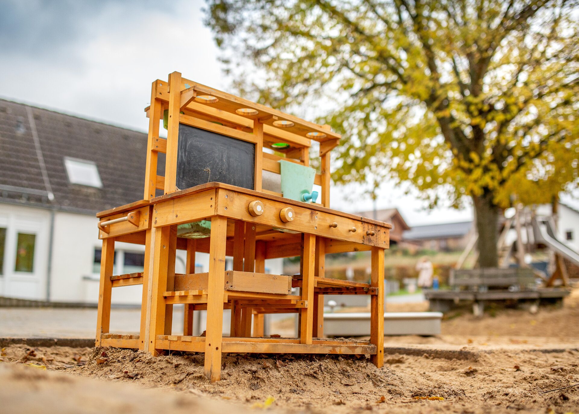 Unsere Matschanlage mit Handpumpe ist an warmen Tagen der Magnet für alle Wasserliebhaber. Zum Schutz vor der Sonne spenden Bäume, Sträucher, Sonnensegel und Schirme ausreichend Schatten.