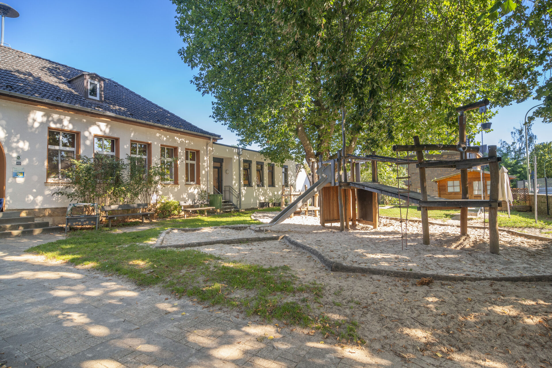Die alten Baumbestände auf dem Außengelände bieten viele Möglichkeiten zum Spielen. Hier befinden sich ein Piratenschiff, eine Wassermatschanlage, eine Schaukel usw. Im Spielzeugholzhaus finden die Kinder eine Vielzahl von Sandspielzeugen sowie Bobbycars, Laufräder, Roller usw.