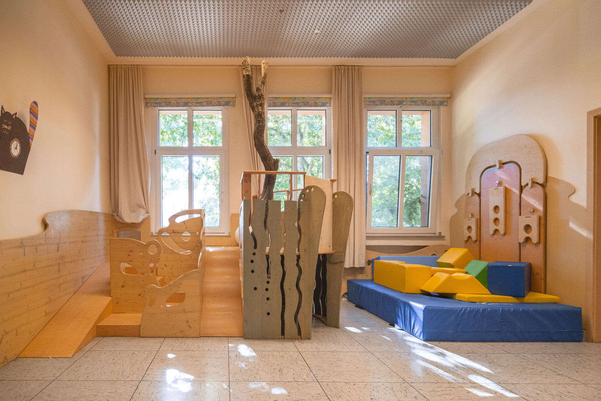 Es gibt keine Möbel "von der Stange", sondern ganz individuell auf die Bedürfnisse der Kinder abgestimmte "Bewegungslandschaften", die innovativ und nach den neusten Erkenntnissen in der modernen Pädagogik von einem Architekten eigens für unsere Einrichtung entworfen und geschreinert wurden.