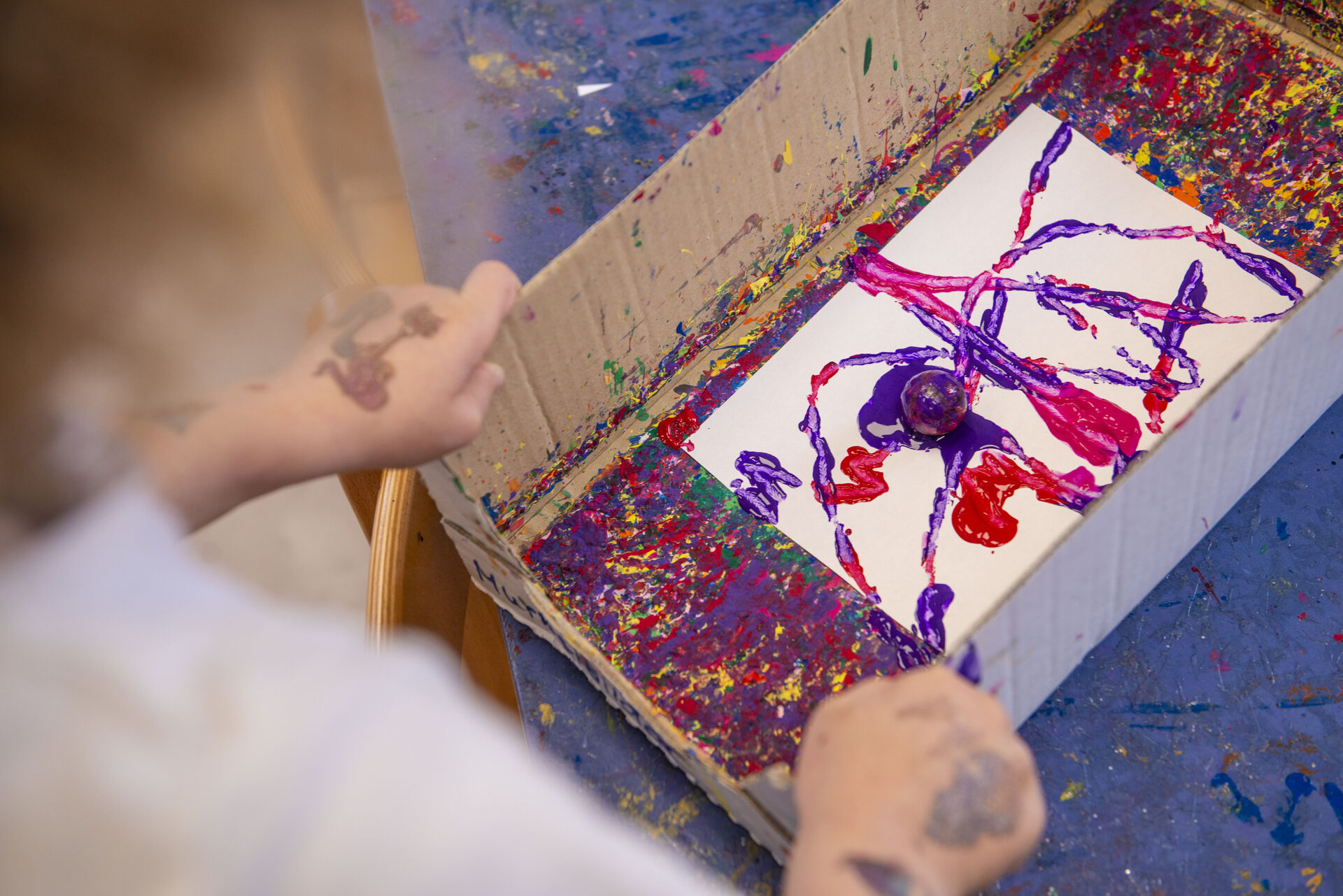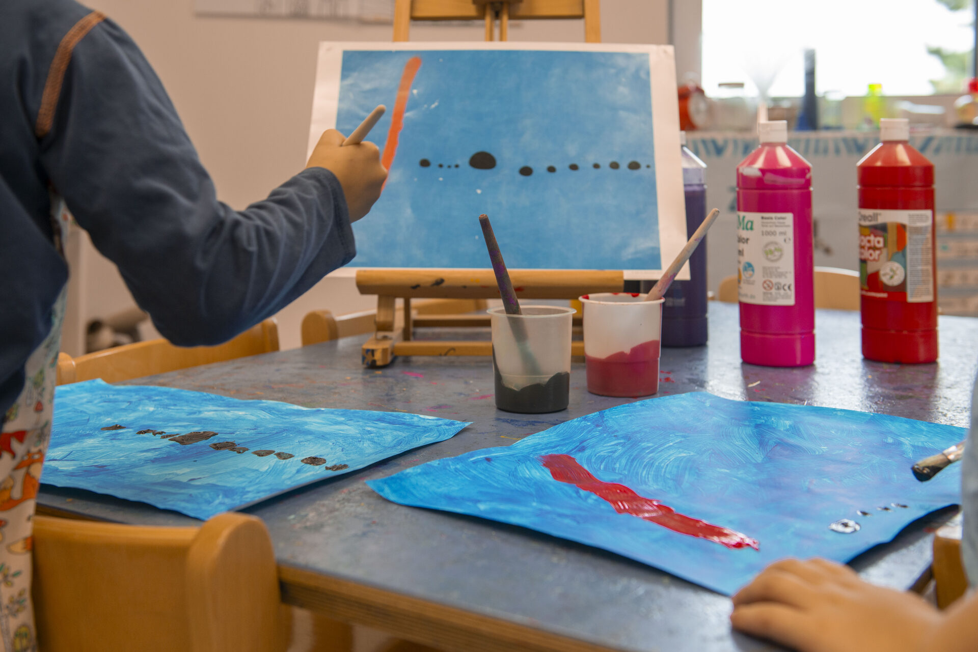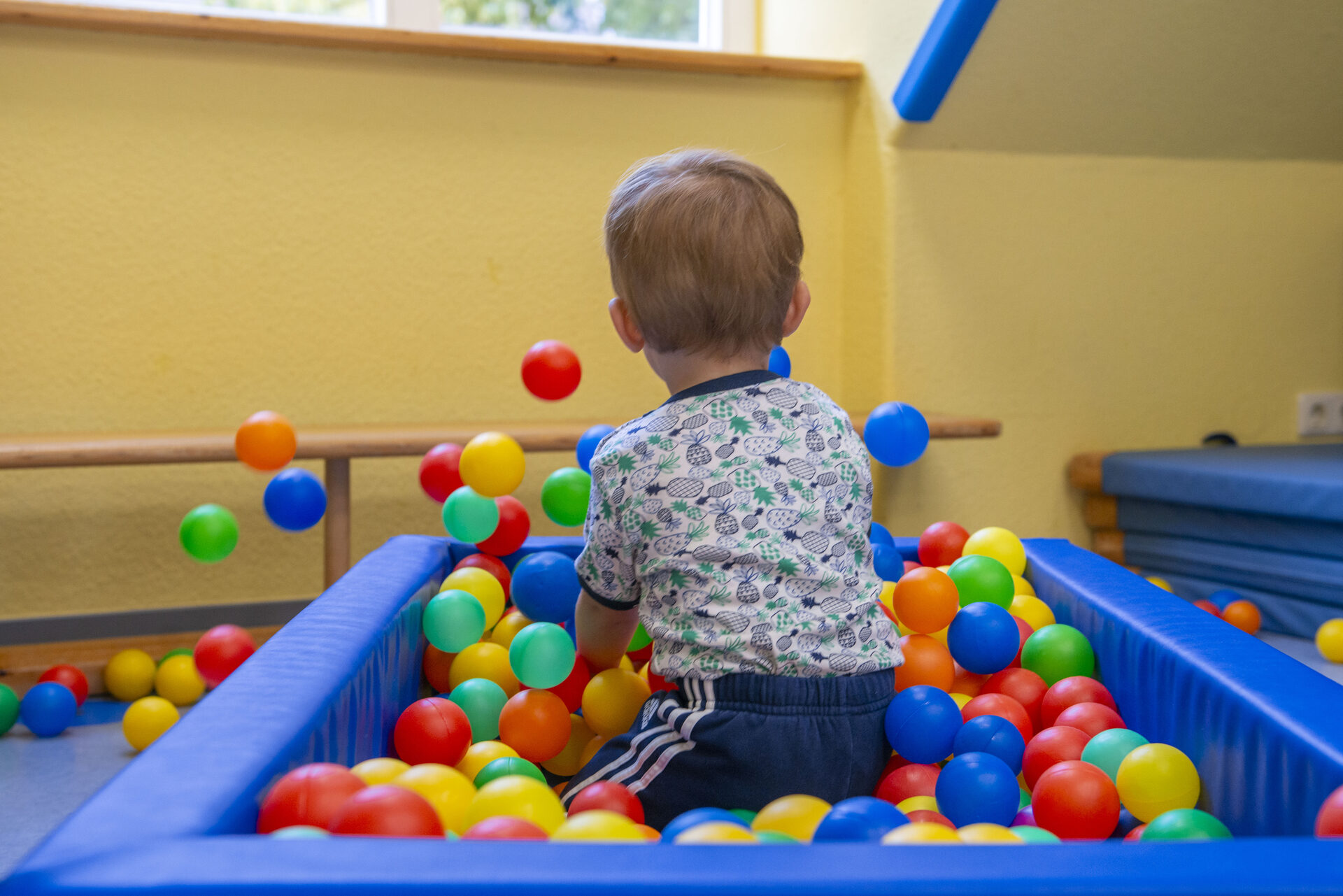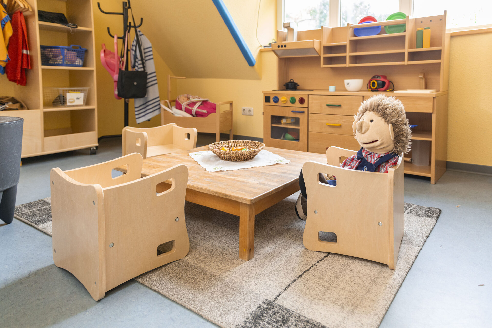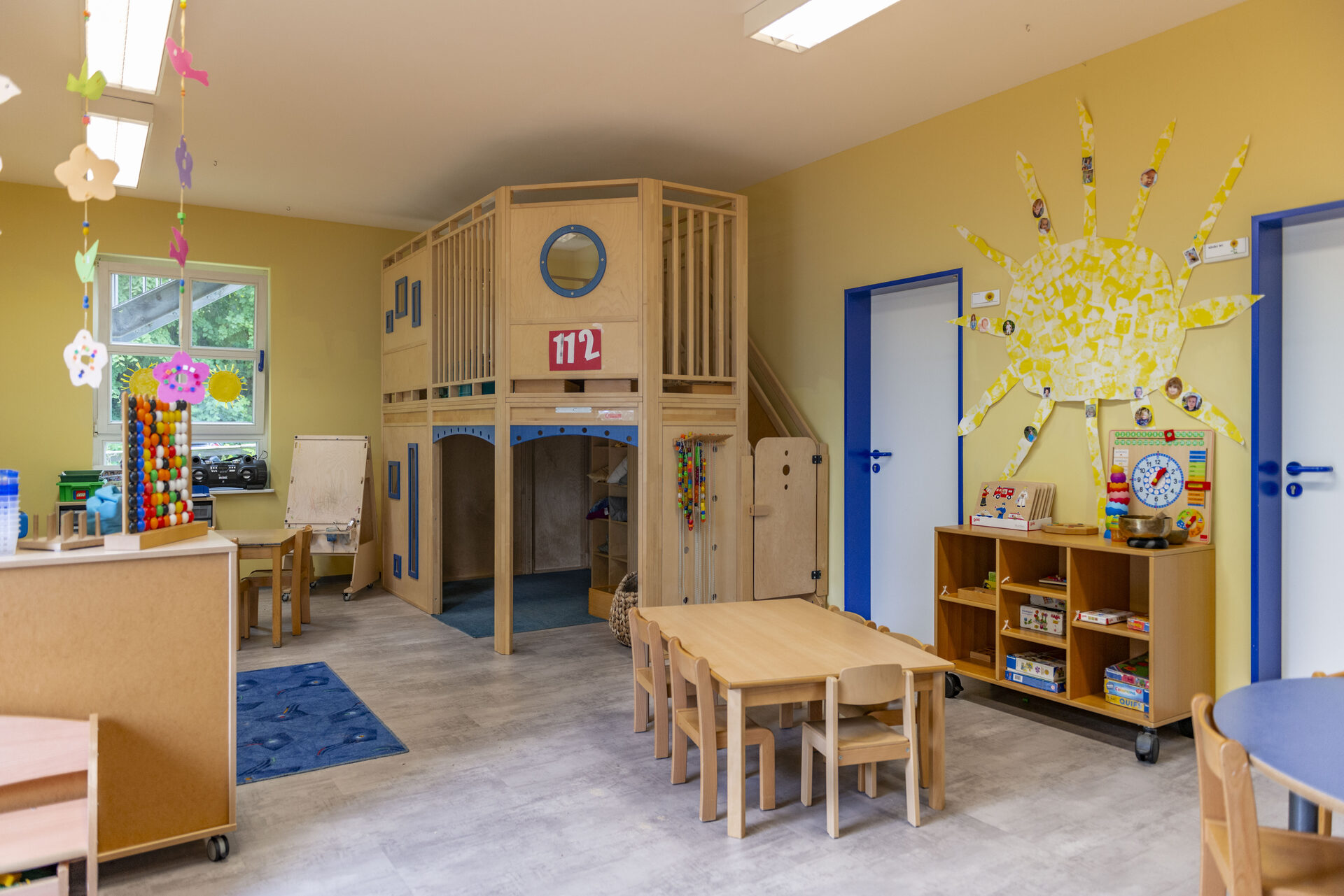 Unsere Räumlichkeiten befinden sich auf zwei Etagen, sie bieten Platz für vielfältige und unterschiedliche Angebote und bieten zugleich Sicherheit und Geborgenheit. Jedes Kind hat eine feste Gruppe (Stammgruppe). Da unsere Türen alle offen sind, können die Kinder sich gegenseitig besuchen, was auch gerne angenommen wird. Wir arbeiten Gruppenübergreifend, dass bedeutet, das Kinder in Kursen und Angeboten zusammentreffen. Jede Gruppe verfügt über 1 Waschraum, 1 Abstellraum, 1 Gruppenraum und 1 Nebenraum. In der oberen Etage befindet sich 1 Wickelraum und ein 1 Mehrzweckraum. In der unteren Etage befindet sich 1 Spielflur, die Küche und das Büro.