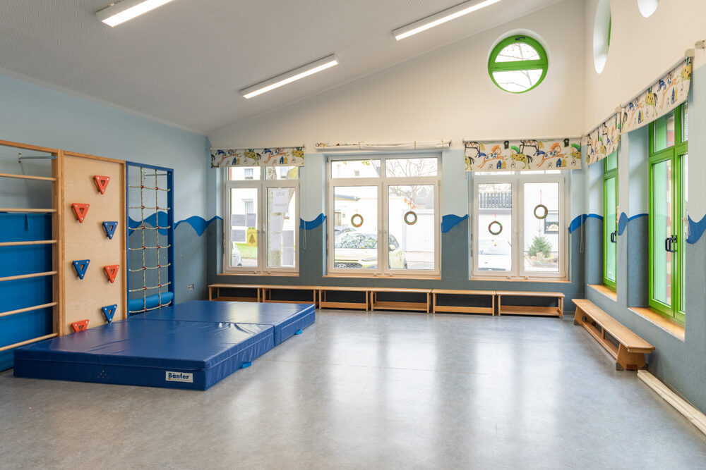 Unsere Kita liegt in einem kleinen, ländlichen Ort umgeben von Feldern und Wiesen mit verschiedenen Tieren ( Pferden, Schafen, Hühnern). Die Einrichtung ist ein moderner, farbenfroher Bau mit großen Fenstern und Bullaugen. Die Innengestaltung ist ebenfalls farbenfroh, sehr geräumig und einladend. Zu den vier Gruppenräumen gehören noch jeweils ein Nebenraum, ein Waschraum, Toiletten und ein Wickelraum. Die beiden großzügigen Eingangshallen dienen als Erlebnis- und Entdeckungshallen und laden zur Bewegung, Kommunikation und Kontaktaufnahme ein. Zudem verfügt unsere Einrichtung über einen Sprachraum und einen langen Flur, der als Bewegungsbaustelle dient und täglich genutzt werden kann. Weitere Räume sind eine große Turnhalle mit angrenzendem Materialraum , eine Küche mit zwei danebenliegenden Essräumen, ein Besprechungszimmer, ein Personalraum, ein Büro und verschiedene Räume zur Aufbewahrung von Spiel- und Bastelmaterialien und zwei Hauswirtschaftsräume.