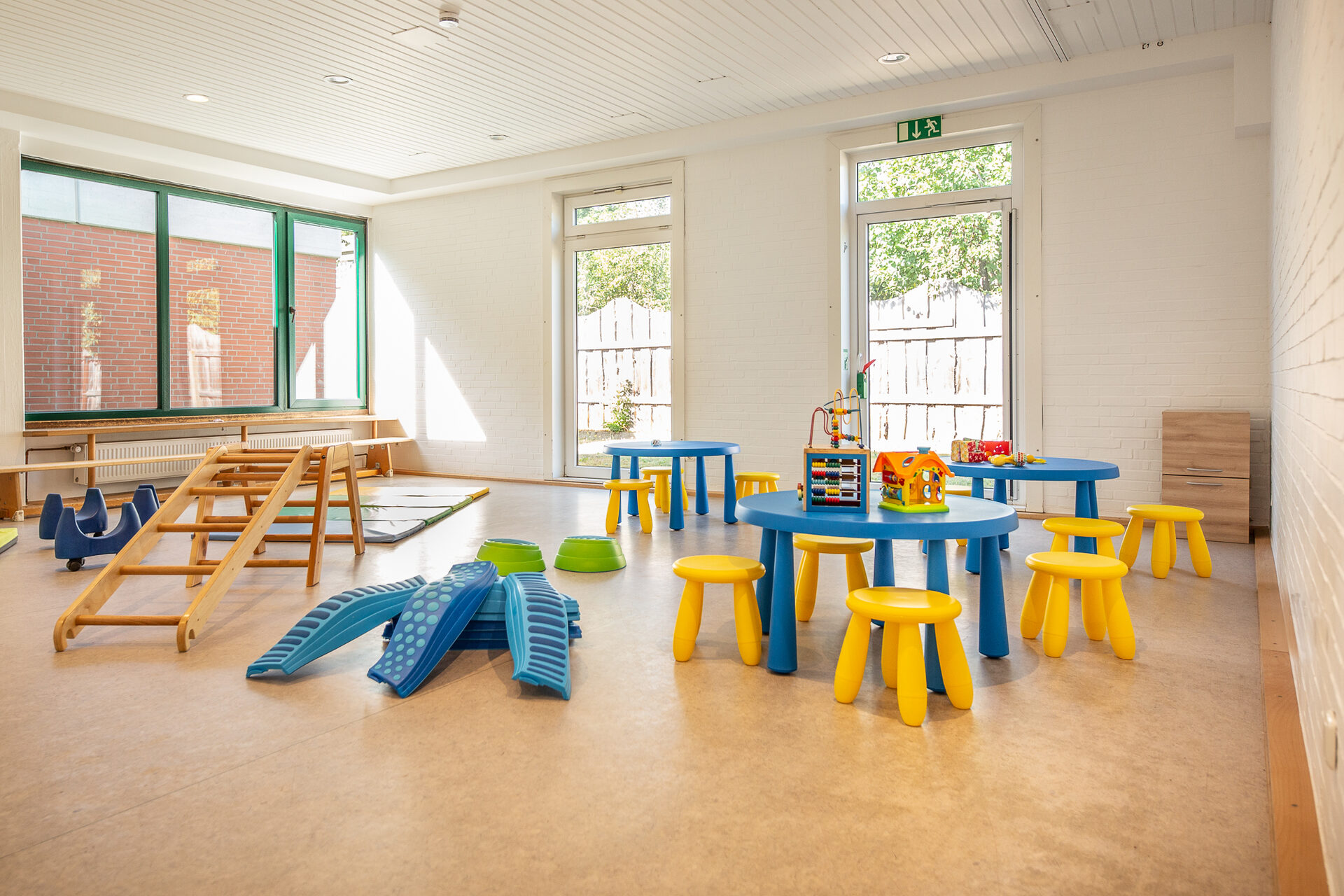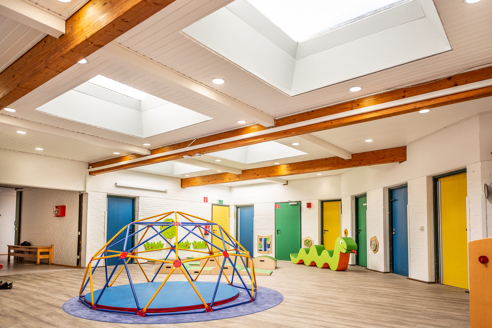 Unsere Kindertageseinrichtung liegt im ländlichem Ort Gey. Die Einrichtung zeichnet sich unter anderem durch die großzügigen, hellen und farbenfrohen Räumlichkeiten aus. Eine große Anzahl an Fenstern macht die Einrichtung hell, freundlich und gemütlich. Zusätzlich zu den Gruppenräumen verfügen 3 Gruppen über je 2 Nebenräume, einem separaten Wickelraum und einem Waschraum. 1 Gruppe hat einen Nebenraum und einen Waschraum, der Wickelraum befindet sich angegliedert in unserer großzügigen Kletterhalle. Im Eingangsbereich befinden sich Therapieräume, Büros und ein der Küche angegliederter großer Speisesaal. Dieser wird auch für andere Aktionen genutzt. Weiterhin gibt es einen Bewegungsraum und mehrere Abstellräume. Gemütlich eingerichtete Nischen dienen als Ruhezonen. Unser Eltern Café hat einen eigenen Raum und kann täglich genutzt werden.