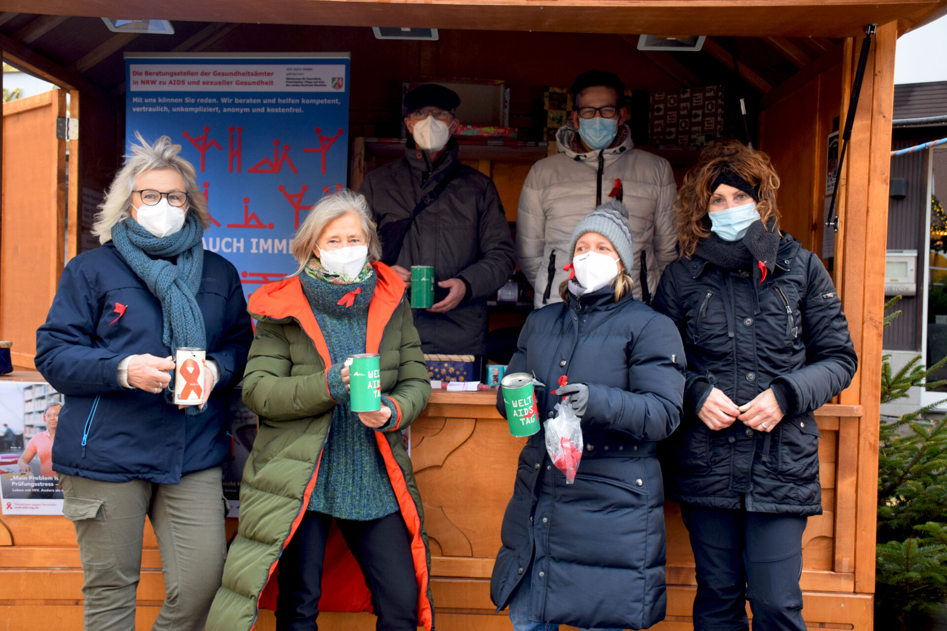 Während im Vormittag die Mitarbeiterinnen und Mitarbeiter der Drogenberatungsstellen den Stand betreuten, ging es ab 14 Uhr thematisch um sexuell übertragbare Krankheiten. Nicole Savelsberg vom Kreis-Gesundheitsamt , Beraterinnen der Drogenberatungsstelle der Caritas, SPZ, Diplom-Sozialpädagogin Lisa Palm von der Aids- und Gesundheitsaufklärung sowie Alfred Schmid, Seelsorger in der Region Düren, und Dominik Schramm von der Rainbow Community klärten auf, beantworteten Fragen, verteilten Infomaterial und sammelten Spenden zu Gunsten Betroffener. Laut Savelsberg war der Schritt auf den Weihnachtsmarkt auch enorm wichtig. „In den vergangenen Monaten standen unsere Angebote aufgrund der Corona-Pandemie nicht wie gewohnt zur Verfügung“, sagte Savelsberg. "Umso wichtiger ist es, darauf hinzuweisen, dass unser Angebot jetzt wieder gilt."