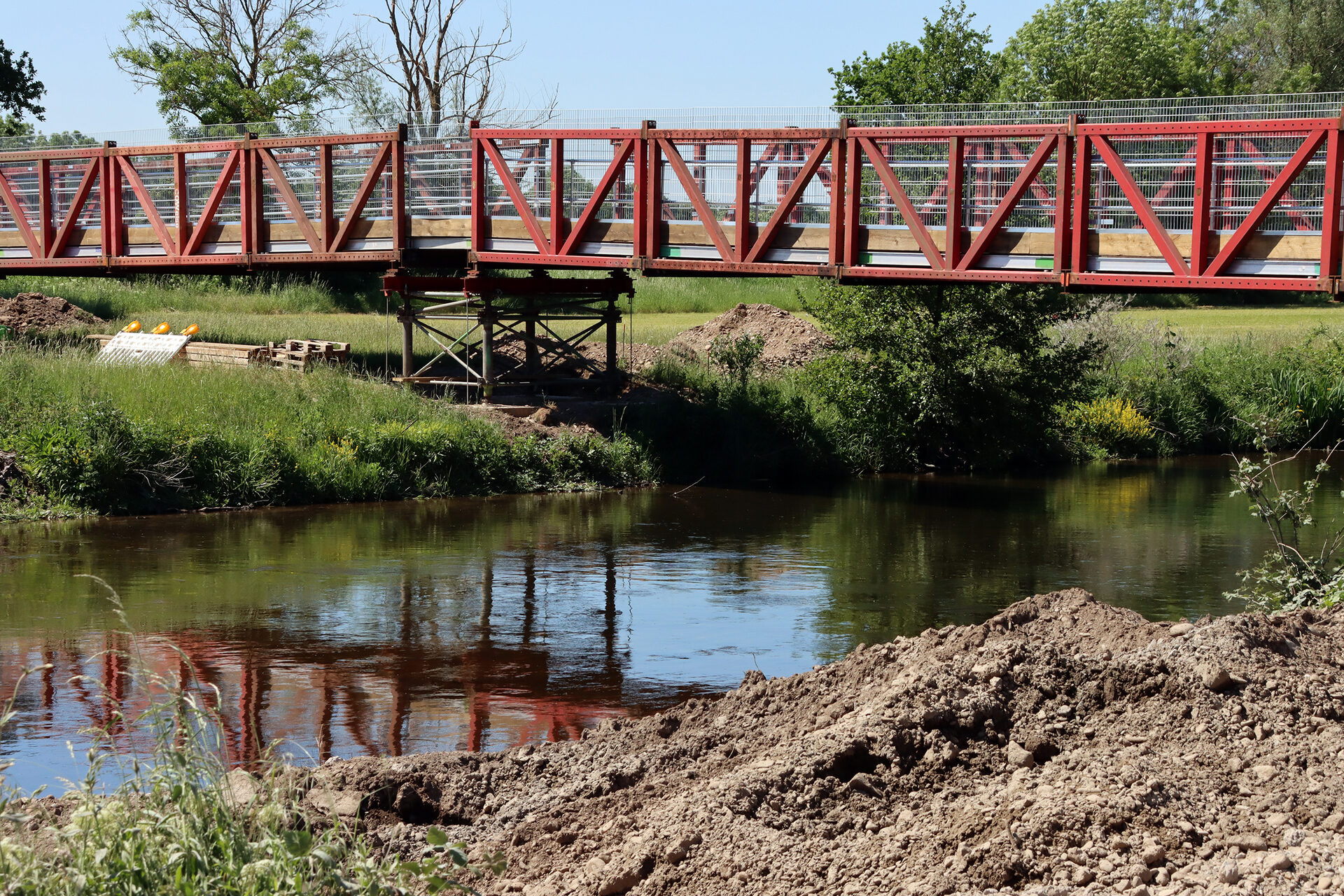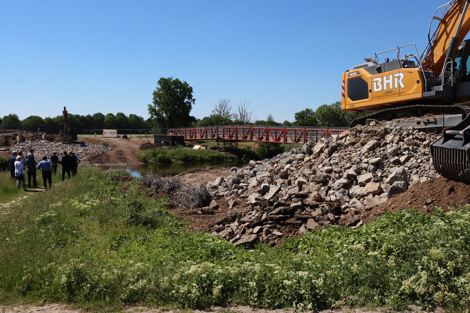 Selhausen und Krauthausen fahren müssen, können Fußgänger und Radfahrer die Rur an gewohnter Stelle auf einer Behelfsbrücke überqueren. RWE-Sprecher Michael Eyll-Vetter bat um Verständnis für die zeitweilige Sperrung und Umleitung auch im Bereich des Rurufer-Radweges. Im Sommer 2022 soll die Straße ganz fertig sein.