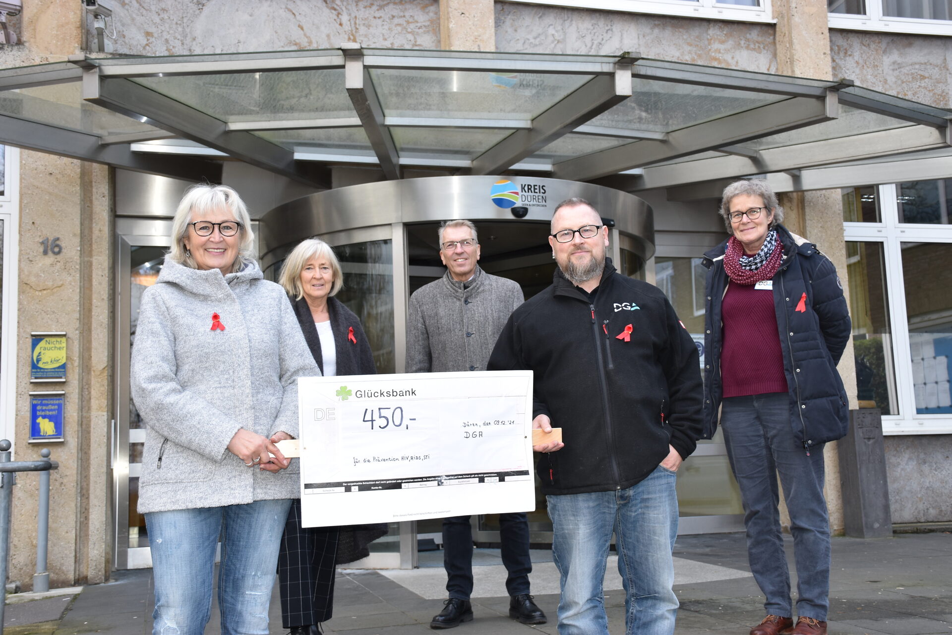450 Euro wurden an einem Tag von der DGA gesammelt, die nun für die Aids-Präventionsarbeit übergeben wurden. Astrid Küpper, Guido Gemünd (beide DGA), Peter Michels (Lions-Club Düren), Nicole Savelsberg (Kreisgesundheitsamt) und Lisa Palm (Aids-Beraterin) (v.r.).