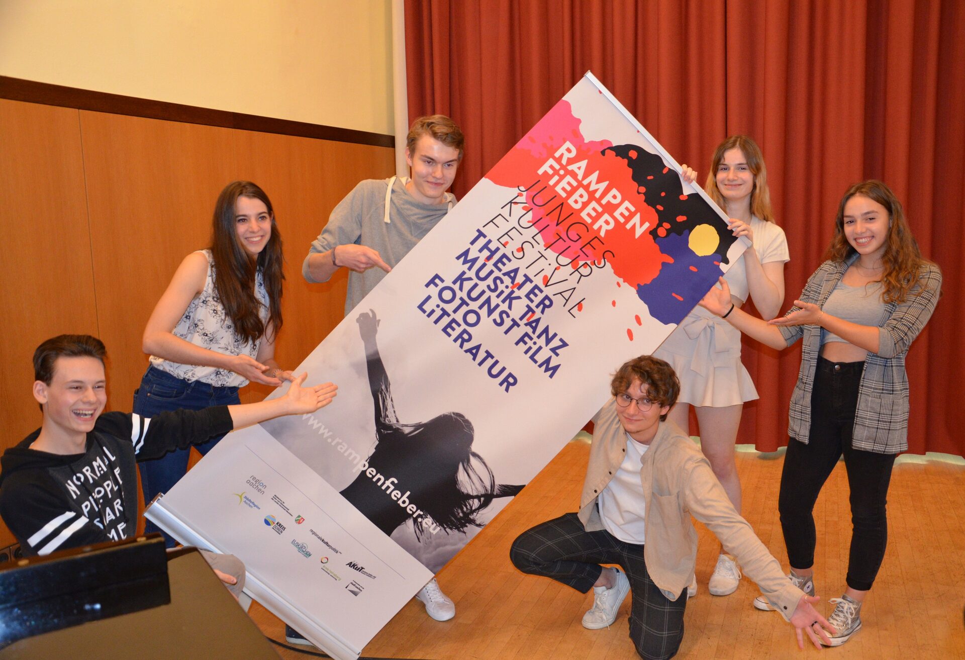 Mitwirkende Jugendliche stellen das Junge Kulturfestival Rampenfieber vor: (v.l.n.r.) Quintus Brinkmann, Kyra Schumann, Patrick Jensen, Kai Neuss, Jasmin Schröder, Marie Candan.