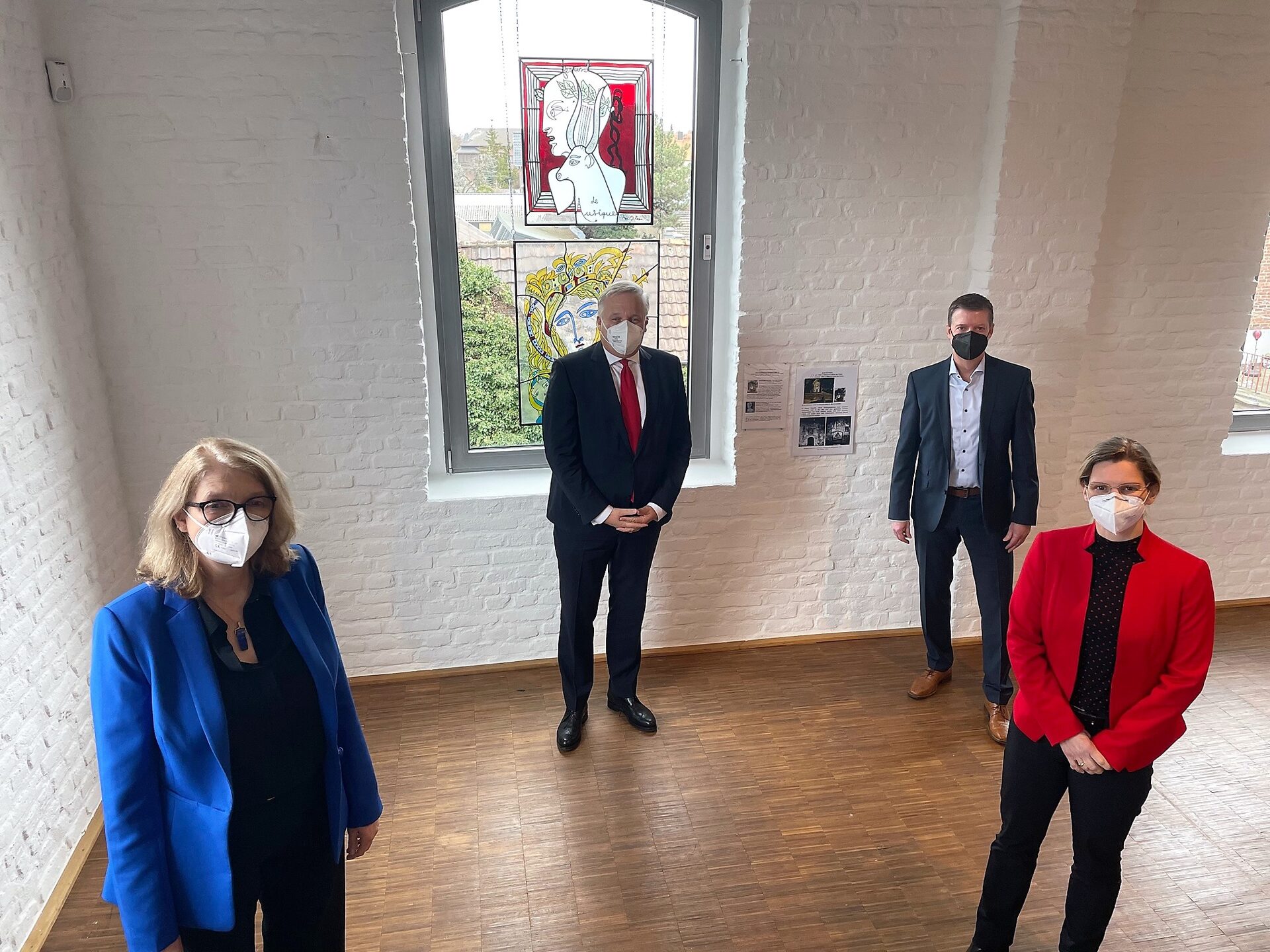 Sind froh über eine gelungene Ausstellung "Gesichter im Wandel der Zeit": Luzia Schlösser, Museumsdirektorin des Glasmalerei-Museums, Wolfgang Spelthahn, Landrat des Kreises Düren und Vorsitzender des Kuratoriums des Glasmalerei-Museums, Carlo Aretz, Geschäftsführer des Glasmalerei-Museums, und Marion Schunck-Zenker, Vorsitzende des Vorstandes Dt. Glasmalerei-Museum und Bürgermeistern der Stadt Linnich (v.l.).