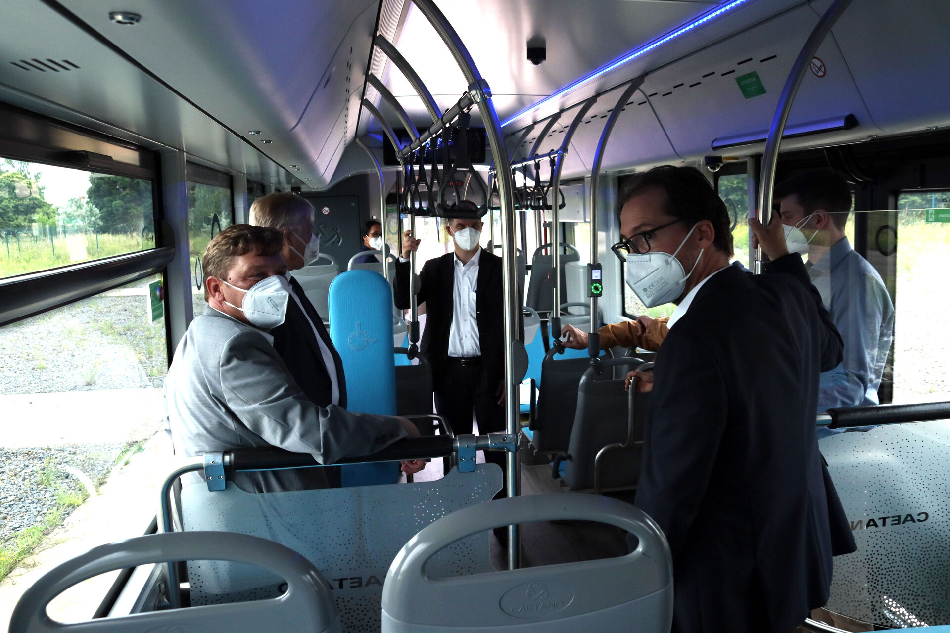 Am Kreisverkehr hält der Bus kurz an, denn Jülichs Bürgermeister Axel Fuchs und Frank Drewes, Geschäftsführer des Brainergy Park, steigen hinzu. "Jetzt sind wir an der Stelle, wo der Grüne Wasserstoff für den Kreis Düren produziert werden soll", sagt Landrat Wolfgang Spelthahn, als der Bus wenige Meter weiter auf dem Gelände zum Stehen kommt und dabei nur einige wenige Tropfen Wasser auf den Asphalt fallen. "Das Ziel ist, den Menschen im Kreis Düren zu zeigen, dass Wasserstoff in einem geschlossenen Kreislauf funktionieren kann. Dazu gehört die Produktion des Grünen Wasserstoffs und genauso die Nutzung sowohl in Fahrzeugen für die Mobilität, aber auch später in den Firmen und Haushalten. Das wollen wir hier anschaulich machen", so Landrat Spelthahn weiter. "Für die Stadt Jülich hat dieses Projekt eine riesige Bedeutung", sagt Bürgermeister Axel Fuchs. "Wir wollen gemeinsam mit dem Kreis Düren Bestandteil eines der größten Klimaschutzprojekte Europas sein. Hier entsteht eine Wasserstoffelektrolyseanlage, die dazu dient, den kompletten ÖPNV im Kreis klimaneutral zu gestalten. Das ist ein Gewinn für uns und die nachfolgenden Generationen."
