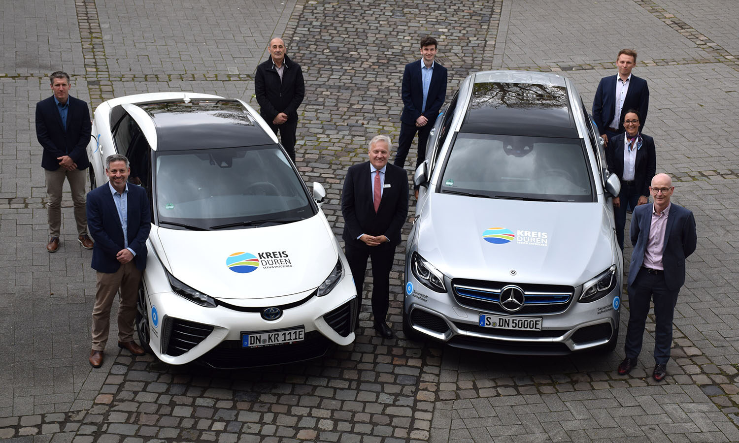 Landrat Wolfgang Spelthahn (vorne Mitte) stellte heute neben den beiden H2-Fahrzeugen des Kreises Düren das neue Wasserstoff-Kompetenzteam des Kreises Düren vor.
