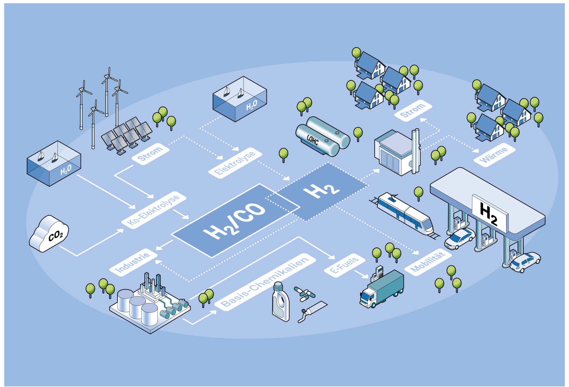 Das FZJ koordiniert zudem das Forschungsprojekt „iNEW“ (Inkubator für Nachhaltige Elektrochemische Wertschöpfung“), einer offenen Innovationsplattform, die Entwickler und Industrie zusammenbringt. Zusammen mit regionalen Unternehmen soll ein großes Netzwerk entstehen, um klimaschädliches CO2 mithilfe neuer Technologien als nachhaltigen Rohstoff nutzbar zu machen. Dabei spielt auch der Wasserstoff eine wichtige Rolle. „Wir in Jülich wollen den Wasserstoff und die Forschung mit Schwung vorantreiben und dabei hilft eine gute Vernetzung und viel Know-How in der Region – beides ist besonders hier im Kreis Düren ausgeprägt, was den Standort so attraktiv macht“, fasst Gillessen zusammen.