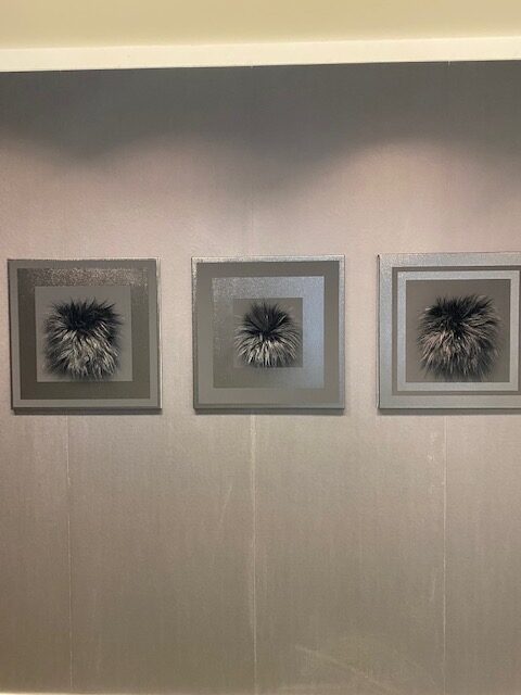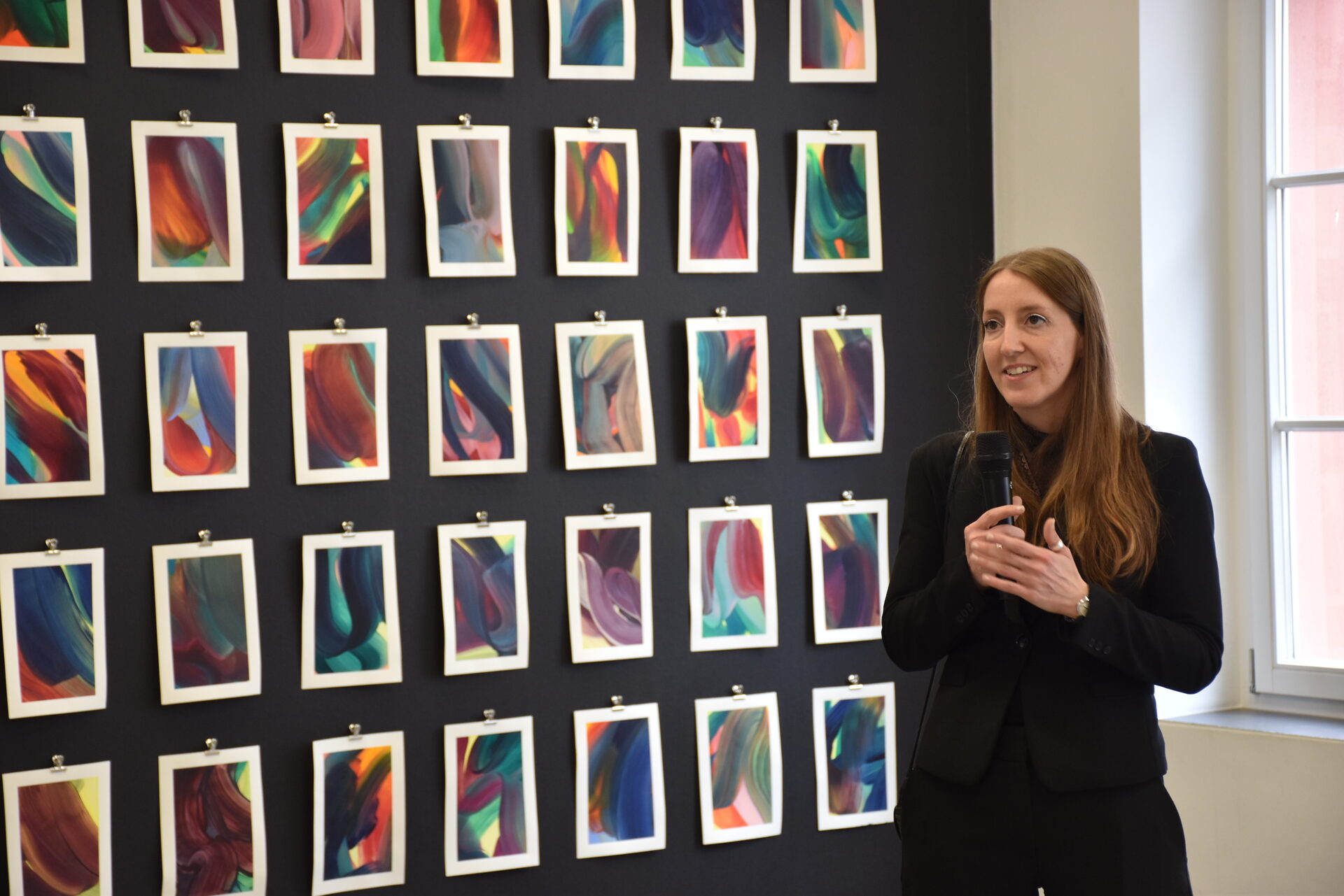 Die ausgestellten Werke zeigen, wie sich Hauswalds Arbeiten während der Pandemie verändert haben. Sieht man zunächst Kunstfellarbeiten in schwarz und weiß, so wird der Weg durch die Ausstellung immer bunter bis hin zu einer Wand voller farbintensiver Bilder, angebracht auf dunkler Tapete. „So eine Wand habe ich noch nie gesehen“, sagte Prof. Frank Günther Zehnder, Leiter der Kunstakademie. „Kein Bild ist wie das andere. Anica Hauswald zeigt einen neuen Umgang mit der Malerei. Ich bin hellauf begeistert.“ Das Spiel mit Kontrasten zieht sich wie ein roter Faden durch die Ausstellung. Als Dank für die Unterstützung schenkte Anica Hauswald der Kunstakademie eines der farbigen Papierarbeiten von der bunten Wand, die viele Besucherinnen und Besucher begeisterte.