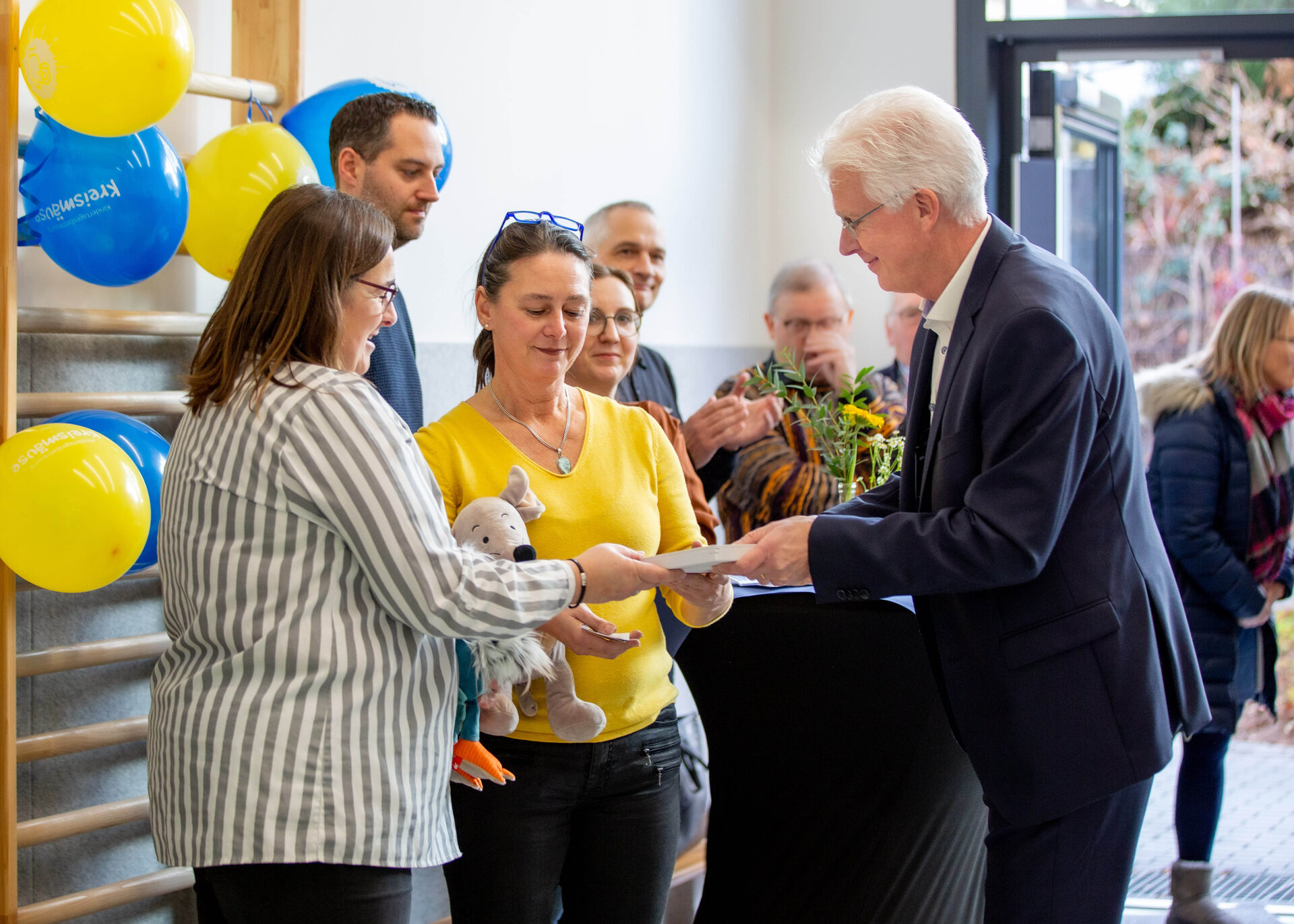 24 Mitarbeiterinnen und Mitarbeiter sorgen dafür, dass sich die Rurmäuse in ihrem neuen Zuhause wohlfühlen und sehr gut betreut sind. Die Kleinen zeigten ihre Freude über die neue Kita auch bei einem Lied, das sie nach der Einsegnung durch die katholischen und evangelischen Pfarrer vorführten. Jeder Gast erhielt zudem ein Geschenk: von den Kindern bemalte Steine, die vor dem Ausbau aus der Grundstücksfläche dem Boden entnommen wurden. Bürgermeister Ingo Eßer überreichte der Kitaleitung das Kreuzauer-Wappen, um die Verbindung zur Gemeinde zu betonen.