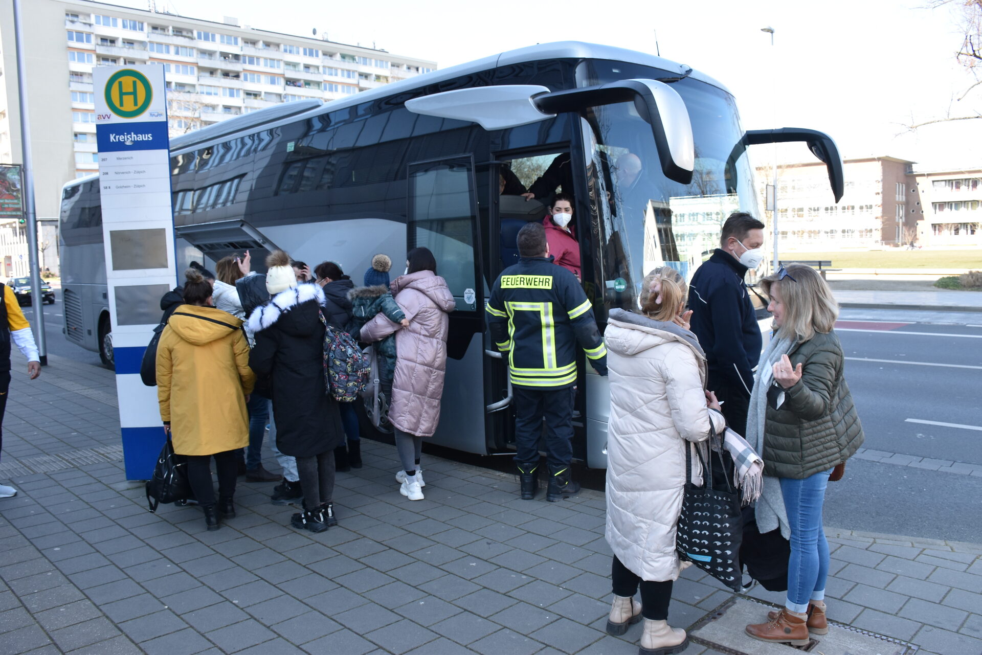 Mit dem silberfarbenen Bus, den Mercedes zur Verfügung gestellt hatte, machte sich die Gruppe auf den Weg nach Düren. Nik Asbach und die zwei weiteren Mitarbeiter der Rurtalbus GmbH wechselten sich bei der 24-stündigen Fahrt ab. Währenddessen war es "auffällig ruhig", wie Asbach berichtet. "Man hat den Menschen schon angemerkt, dass sie traumatisiert sind und ganz schlimme Dinge erlebt haben. Daher war es gut, dass wir eine Ukrainisch sprechende Kollegin dabei hatten, die sich sehr gut um die Menschen gekümmert hat", sagt Asbach. Am Donnerstagvormittag erreichte der Bus dann sein Ziel: die Kreisverwaltung Düren. Hier erwartete die Flüchtlinge und alle beteiligten Helfer eine warme Mahlzeit, Getränke, eine nette Begrüßung und vor allem eine Menge Menschen, die ihre Hilfe angeboten hatten. Willkommensberaterinnen und Dolmetscher des Kommunalen Integrationszentrums des Kreises sowie Menschen, die ihre Wohnungen für einen ersten Aufenthalt zur Verfügung stellen, empfingen die Neuankömmlinge herzlich und in Landessprache. Bereits während der Fahrt wurden ihre Kontakte aufgenommen. "Wir konnten die Familien über Nacht dann nach individuellen Bedürfnissen und Größen der Familien vermitteln", so Asbach. Aufatmen. Der schwierige, ungewisse Teil war geschafft.