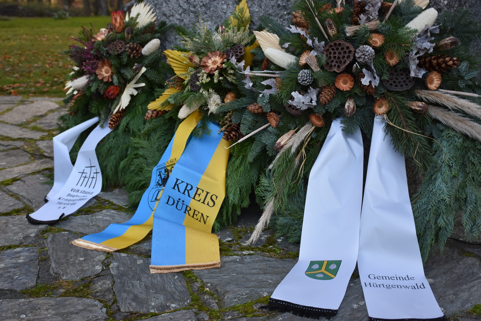 Drei Kränze schmücken nun die Kriegsgräberstätten in Hürtgen und Vossenack. Worte des Gedenkens, Gebete der Hoffnung und mahnende Reden für den Frieden begleiteten die andächtige Veranstaltung an der Kriegsgräberstätte. "Heute ist ein schwieriger Tag", sagte Landrat Wolfgang Spelthahn, der auch Kreisverbandsvorsitzender des Volksbunds ist.