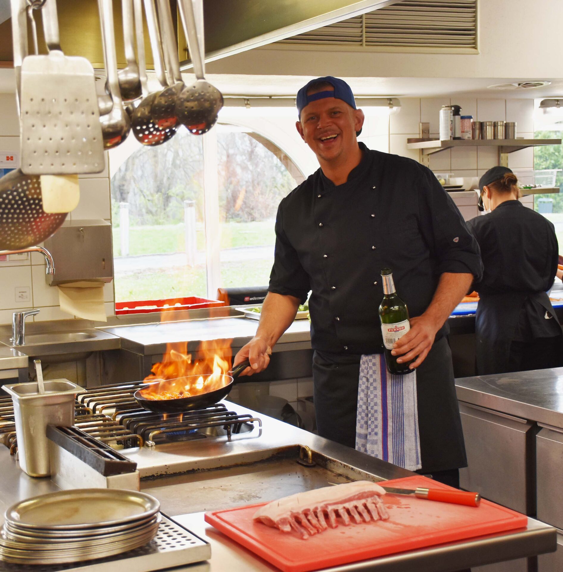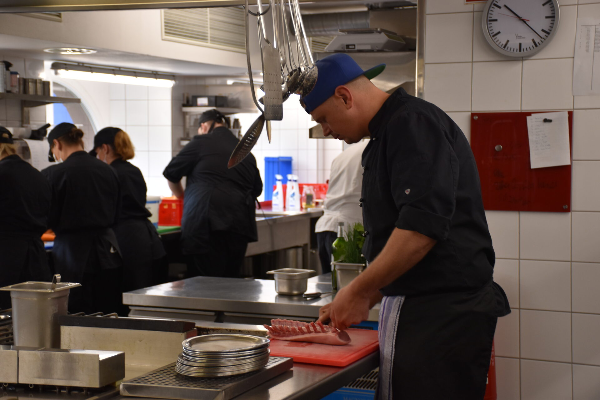 Die Fallmanagerin Olga Oblender informierte Marcel Toussaint über "Gastrofit". "Eigentlich hatte ich mich nie in der Gastronomie gesehen, aber ich wollte es gerne mal ausprobieren und es hat mir überraschenderweise sofort sehr viel Spaß gemacht", erinnert sich Toussaint. Im Dezember 2018 fing er dort an. Der Vorteil: Die Lernenden werden dort durch Sozialpädagogen eng betreut. Sie sind Ansprechpartner und begleiten durch den für viele Teilnehmerinnen und Teilnehmer neuen Alltag, können auf Sorgen und Probleme direkt reagieren. Nicole Pelzer ist bei der DGA für "Gastrofit" zuständig und hat gleich gemerkt, dass in Marcel Toussaint viel Potenzial steckt. "Schon nach ein paar Tagen stand er in der Küche der Arena Kreis Düren hinter einer riesen Bratpfanne und hat mit großer Begeisterung die Bratwürste angebraten und war schon mittendrin im Geschehen. Ich habe das Bild noch genau im Kopf. Das ist am Anfang nicht selbstverständlich, dass sich die Teilnehmer das zutrauen, direkt anpacken und so gut umsetzen." Die DGA hat vier Ausbildungsbetriebe: Die Genuss Are(n)a in der Arena Kreis Düren, das Friedhofscafé Düren, die DGA Lehrküche, wo vor allem Kantinenessen zubereitet wird, und das Gastronomische Ausbildungszentrum in Nideggen. Jede Einrichtung hat andere Anforderungen. Sie zeigen die Vielfältigkeit der Gastronomie.