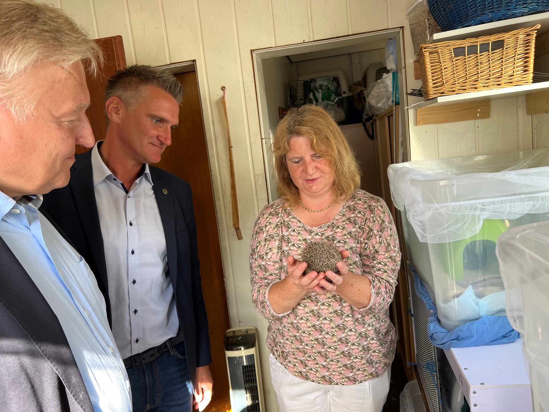 Der Standort Düren, so wurde es bei der Führung durch Hoteldirektor Daniel Rosenow deutlich, profitiert von der Lage zu großen Städten wie Köln, Düsseldorf und Aachen und die Besucherwelle bei Großveranstaltungen „schwappt über”. „Das Hotel wächst und hat eine hohe Auslastung. Das heißt, dass das Hotel hier gut angenommen wird, was uns natürlich sehr freut”, sagt Landrat Wolfgang Spelthahn. Der Tourismus und auch der Besuch von Business-Gästen sind für den Kreis Düren wichtig. So soll auch bald in Jülich, im neuen Schwanenquartier, ein weiteres Hotel der Kette errichtet werden. Putzig und zugleich traurig wurde es zum Finale der Sommertour. Landrat Wolfgang Spelthahn besuchte die Tiernothilfe Niederzier um Tanja Fey. Sie und viele weitere engagierte Vereinsmitglieder kümmern sich in erster Linie um verletzte Igel, die auf dem kleinen Grundstück in Ellen wieder fit für die Wildnis des Kreises Düren gemacht werden.