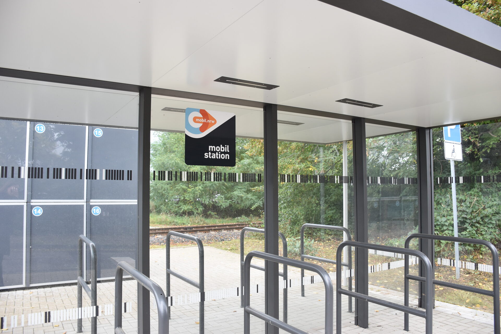 Der Kreis Düren startete – als einer der ersten Kreise – das umfangreiche Projekt zu den Mobilstationen bereits im Jahr 2019 und nimmt damit eine Vorreiterrolle ein. Das Gesamtkonzept wurde aufgrund von Praxiserfahrungen aus dem Kreisgebiet verbessert, erweitert und mittlerweile auch an anderen Standorten umgesetzt. In 13 Kommunen des Kreises Düren wurden insgesamt 49 Mobilstationen errichtet. Der Zweckverband go.Rheinland fördert die Stationen zu 90 Prozent, zehn Prozent zahlen die Kommunen selbst. Rund 2,1 Millionen Euro wurden investiert. Die Mobilstationen sind barrierefrei und bieten insgesamt 388 Plätze für Fahrräder an Bügeln und 225 Stellplätze in Boxen. Zudem gibt es kleine Wartehallen, deren Dächer bepflanzt und die mit Photovoltaik-Modulen für die Beleuchtung der Stationen ausgestattet sind.