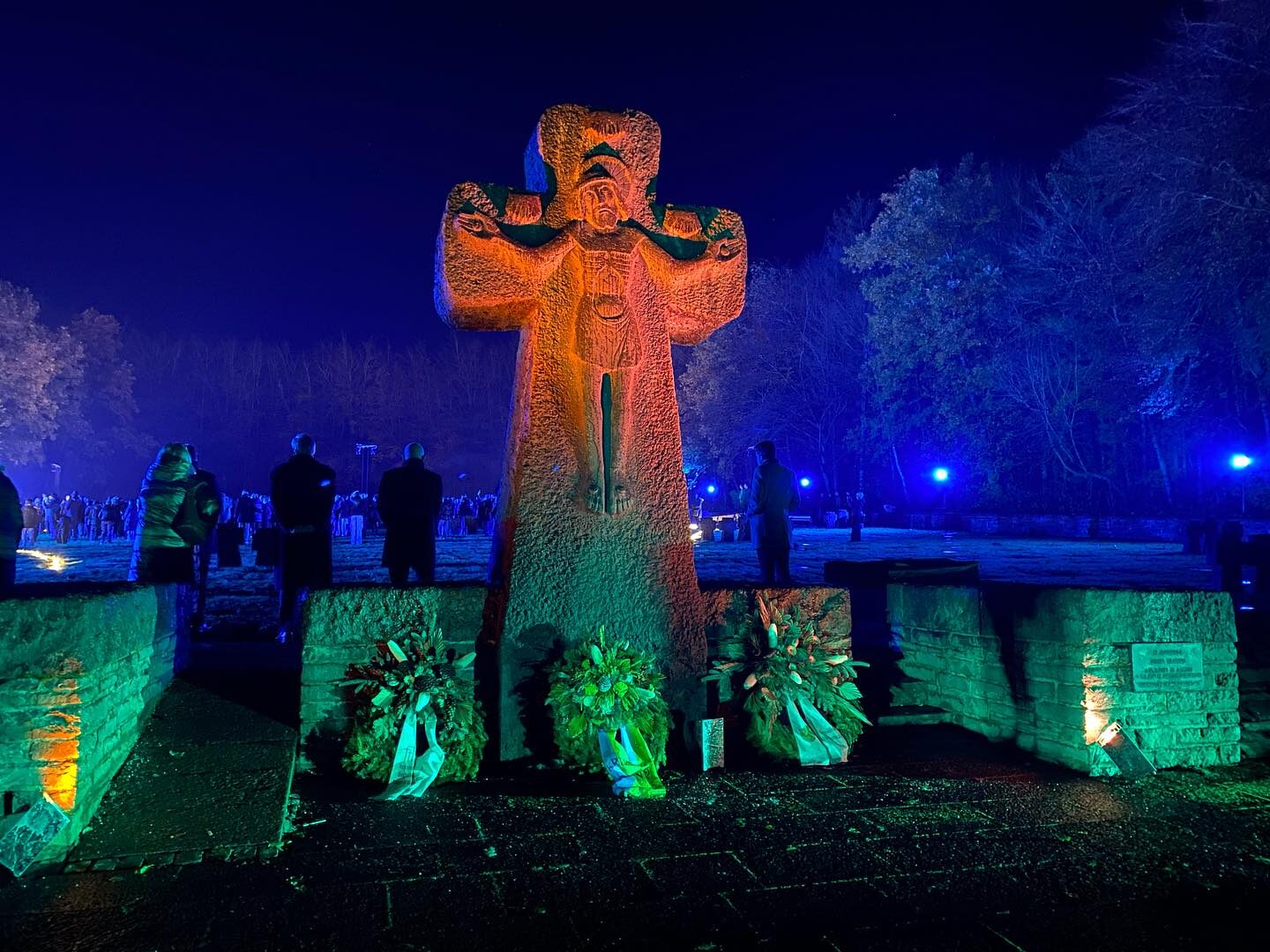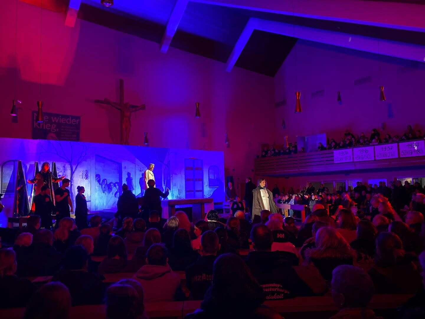 Die Schülerinnen und Schüler des Franziskus-Gymnasiums Vossenack haben bei der Gedenkfeier ein imposantes und zum Nachdenken anregendes Programm entwickelt. Die Inszenierung fand in der komplett gefüllten Klosterkirche Vossenack und auf der benachbarten sowie illuminierten Kriegsgräberstätte statt. „Faceing Peace“ (dem Frieden ein Gesicht geben) sollte zum Ausdruck bringen, dass Frieden nicht selbstverständlich und kein Geschenk ist. Die Vorstellung des „exART“ Musiktheaters des Gymnasiums, unter der Leitung des Lehrers und Organisators Clemens Amendt, bot den Zuschauerinnen und Zuschauern eindrucksvolle Einblicke in die aktuelle Thematik von Krieg und Frieden. Zu Beginn wurde in 16 Sprachen „Frieden“ gesungen. Musik, Gesang, Tanz, Schauspiel und Lichtinstallationen sorgten für eine äußerst andächtige Stimmung.