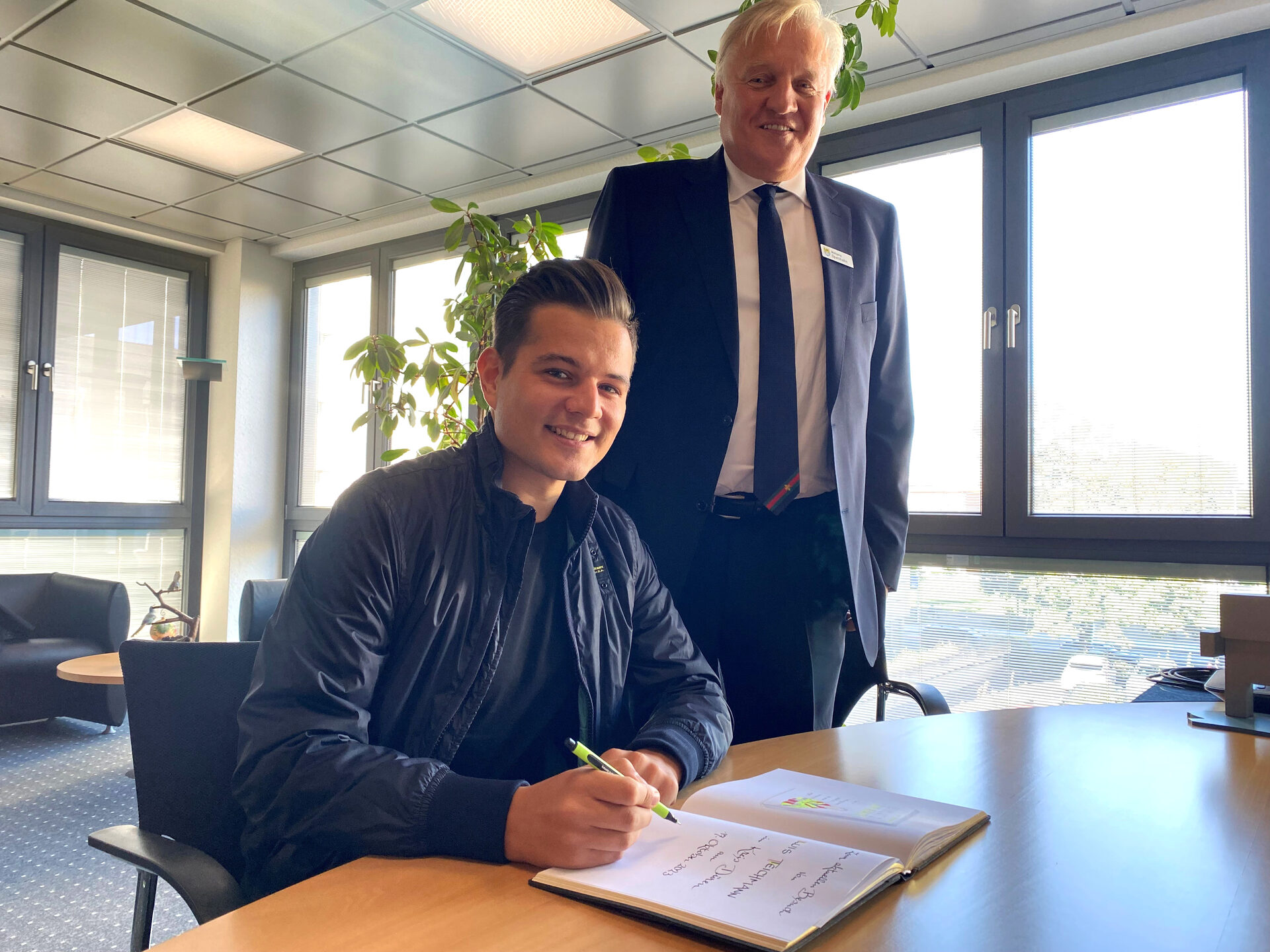 Influencer und Rettungssanitäter Luis Teichmann trägt sich auf Einladung von Landrat Wolfgang Spelthahn ins Goldene Buch des Kreises Düren ein.