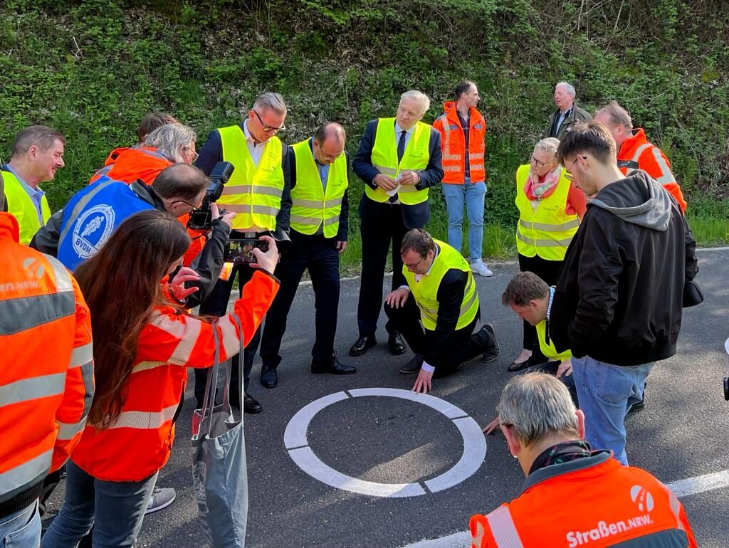 Zum offiziellen Start dieser Probephase hat sich NRW-Verkehrsminister Oliver Krischer heute gemeinsam mit Landrat Wolfgang Spelthahn und Vertreterinnen und Vertretern vom Landesbetrieb Straßen.NRW und der RWTH Aachen ein Bild von den Ellipsen gemacht, die nun die kurvenreiche L218 zwischen Vossenack und Schmidt zieren.