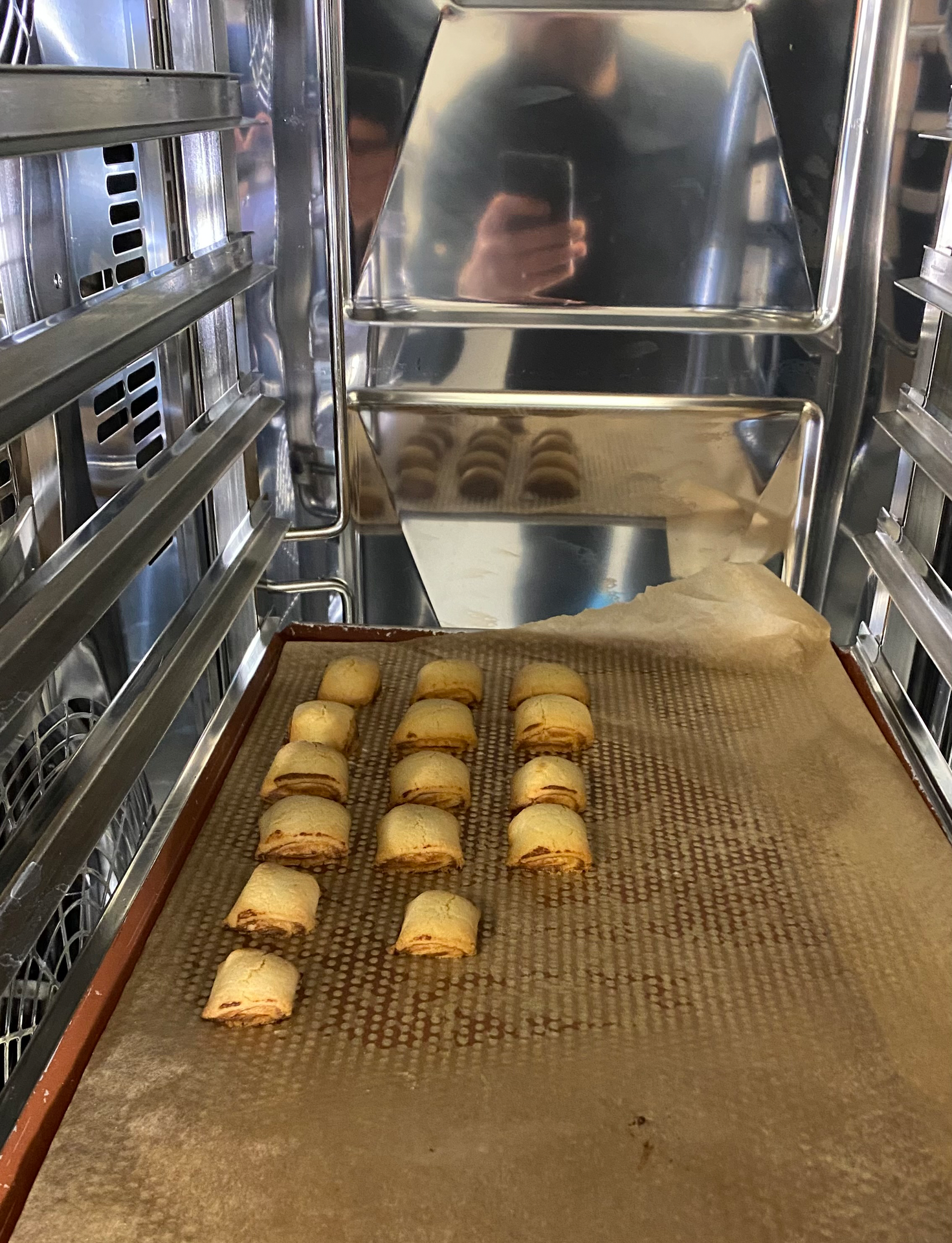 Den Teigstreifen der Länge nach aufrollen, in gewünschte Breite schneiden und die so Portionierten Kissen auf ein mit Backpapier ausgelegtes Backblech legen.