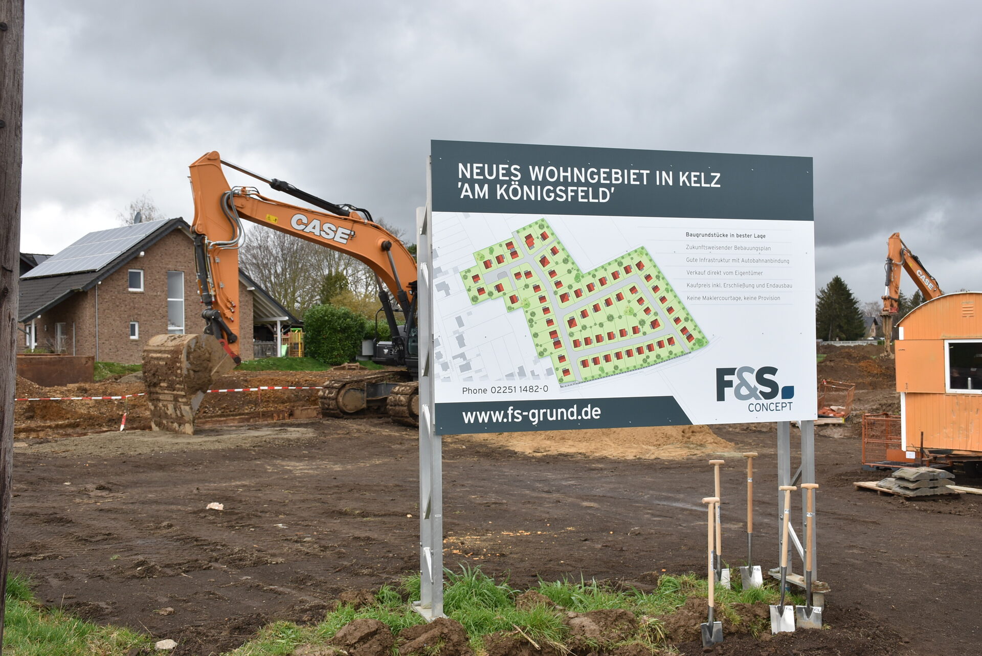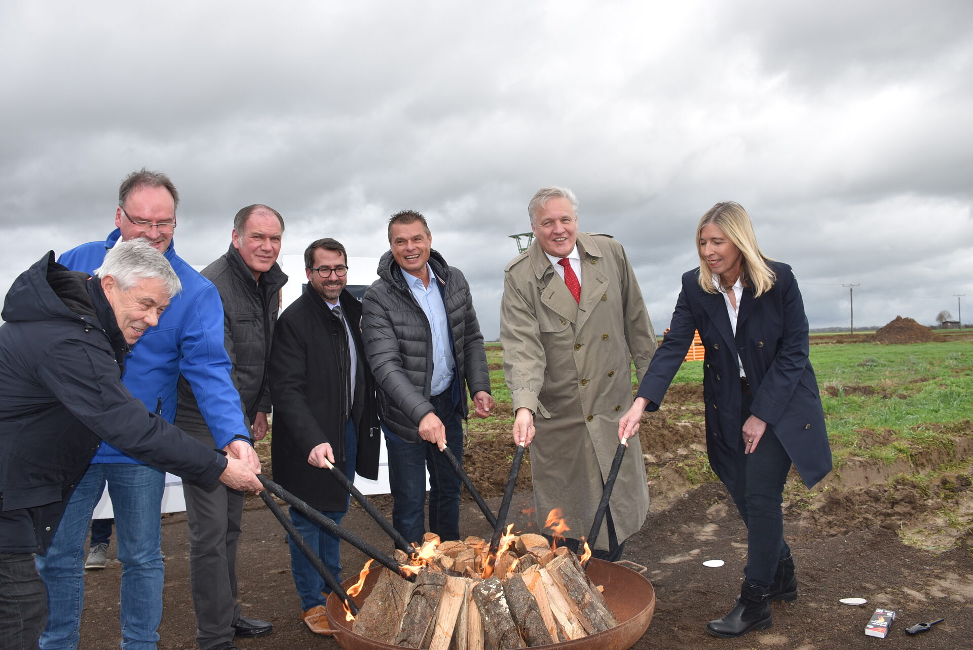 Bei der öffentlichen Vorstellung des neuen Baugebietes "Am Königsfeld" ließen Landrat Wolfgang Spelthahn, Bürgermeister Joachim Kunth und F & S-Geschäftsführer Jörg Schmiedel die sonst üblichen Spaten links liegen und griffen in Anlehnung an einen mittelalterlichen Brauch zu Fackeln. Das rund 42.000 Quadratmeter große Baugebiet, in dem Platz für über fünf Dutzend Häuser ist, liegt nämlich an der ehemaligen Straße, welche die im Mittelalter in Frankfurt gewählten Könige nutzten, um sich im Aachener Dom krönen zu lassen.