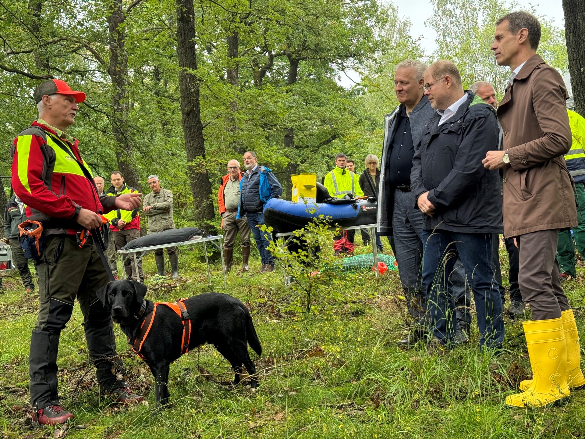 Dr. Martin Berges, Staatssekretär im Ministerium für Landwirtschaft und Verbraucherschutz des Landes Nordrhein-Westfalen, und Landrat Wolfgang Spelthahn sowie Hürtgenwalds Bürgermeister Stephan Cranen haben sich vor Ort ein Bild von den koordinierten Abläufen machen können und lobten die gute Vorbereitung für den Ernstfall, der, so sind sich alle Beteiligten einig, hoffentlich nicht eintreten wird.