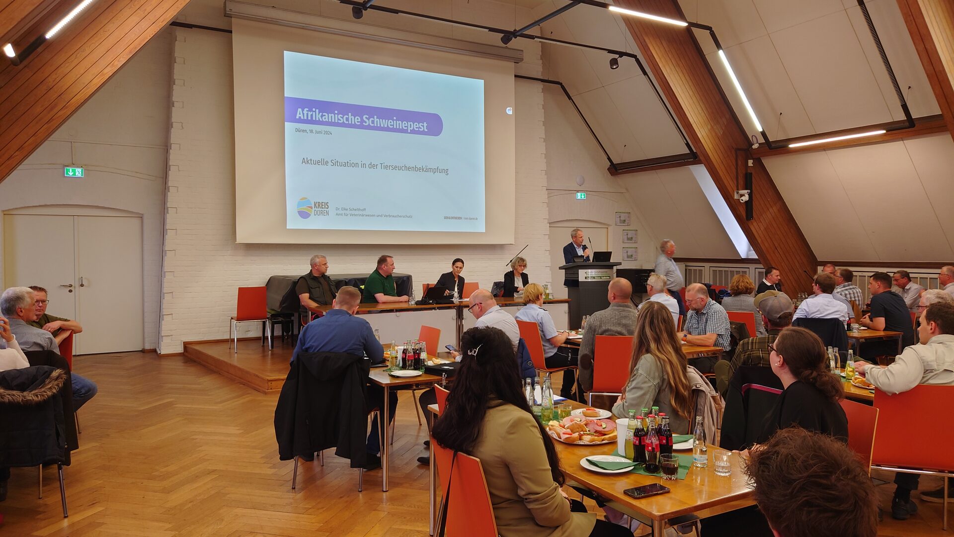 Vor der groß angelegten Übung im Hürtgenwald fand am Vorabend eine große Informationsveranstaltung in der Landwirtschaftsschule in Düren statt, bei der sich rund 70 geladene Gäste aus der Jägerschaft, der Landwirtschaft und beteiligten Behörden fachlich über die ASP ausgetauscht haben. Dabei zeigten das Veterinäramt des Kreises Düren sowie die WSVG ihr Vorgehen im Ernstfall und machten auf Präventionsmaßnahmen aufmerksam. Praktische Demonstrationen rundeten den informativen Abend in Düren ab.