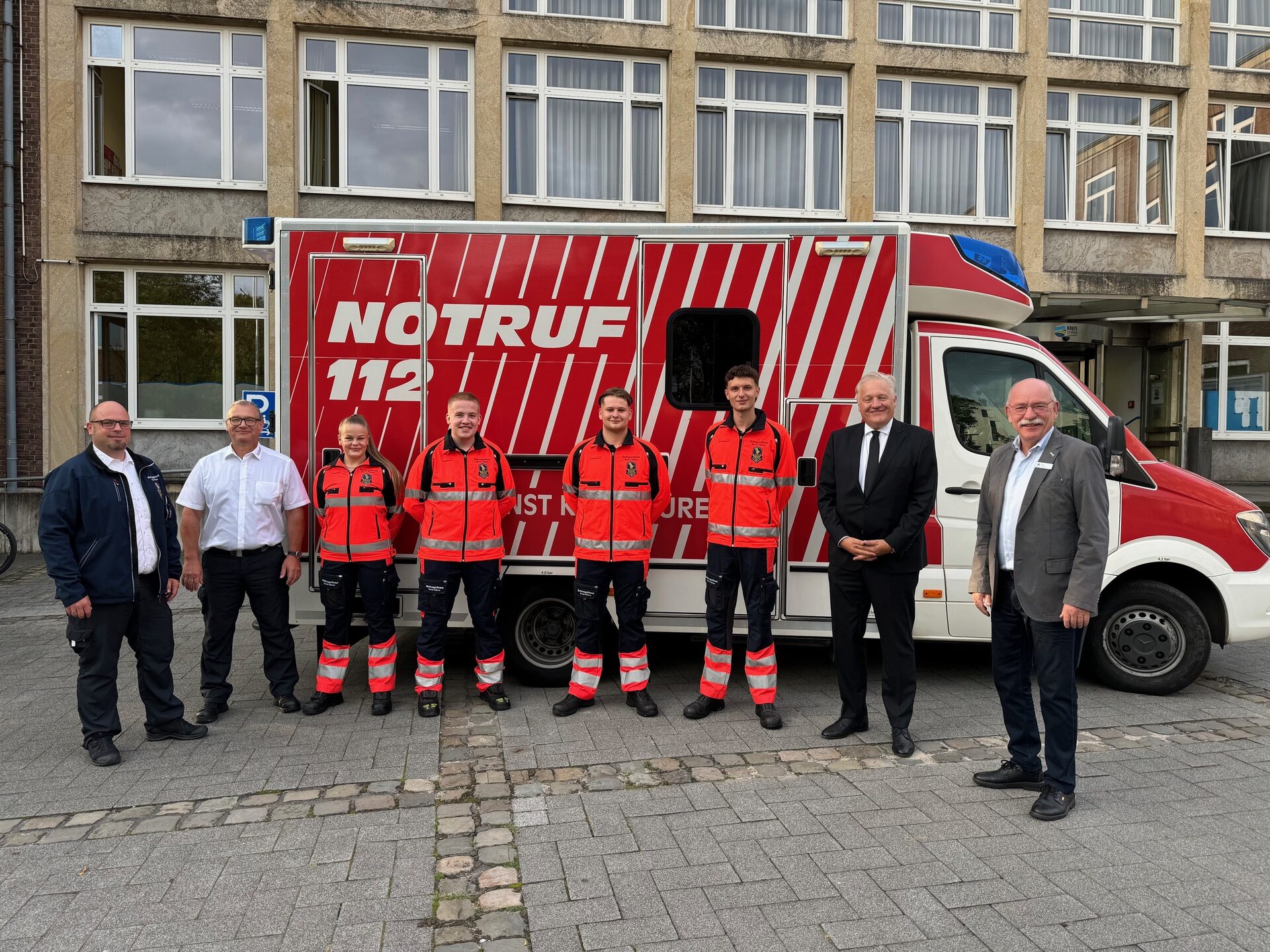 An ihrer Seite sind unter anderem Michael Wimberger, leitender Praxisanleiter, und Robert Engels, Leiter des Einsatzdienstes, die den Azubis ebenfalls alles Gute wünschen.