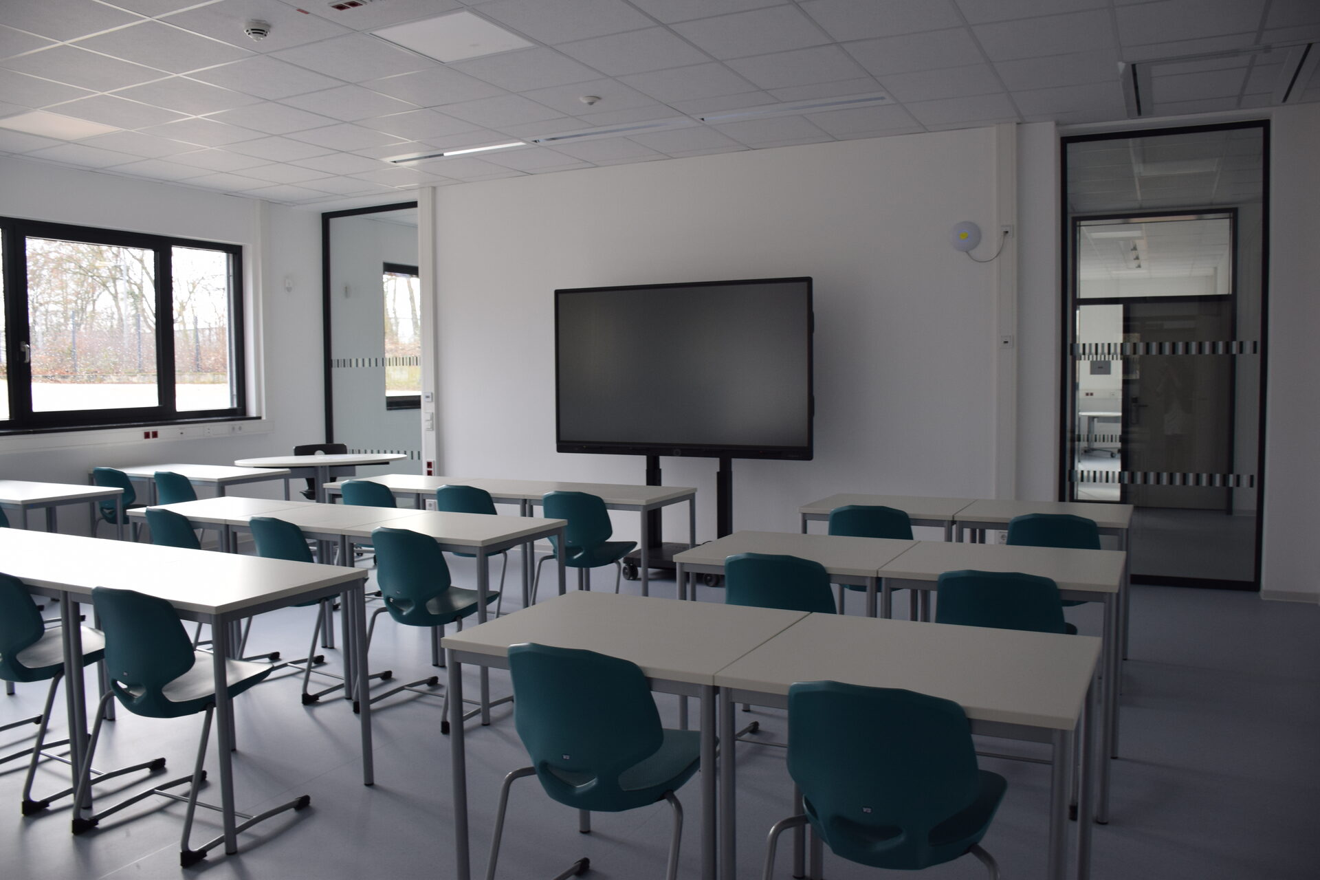 "Wir investieren in die Zukunft, in die Schülerinnen und Schüler, in die Region. Der Neubau symbolisiert dies. Im Rahmen des Strukturwandels setzen wir auf den Rohstoff Bildung. Sie ist ein hohes Gut und hier steckt viel Potenzial auch für die Unternehmen, die sich auf gut ausgebildete Mitarbeiterinnen und Mitarbeiter freuen können. Es erfüllt mich mit Stolz, dass wir heute offiziell diese Türen öffnen können", sagte Landrat Wolfgang Spelthahn zur Begrüßung der rund 40 Vertreterinnen und Vertretern aus Verwaltung, Politik, Schul- und Bauwesen. In dem neuen rund 15 Meter hohen Gebäude lernen derzeit neun Schulklassen des Wirtschaftsgymnasiums. Neun Klassenräume, zwei Beratungs- beziehungsweise Lehrräume sowie sechs sogenannte Differenzierungsräume verteilen sich auf drei Geschosse. Differenzierungsräume sind vielfältig nutzbare Räume für Besprechungen, Elterngespräche oder Unterricht.