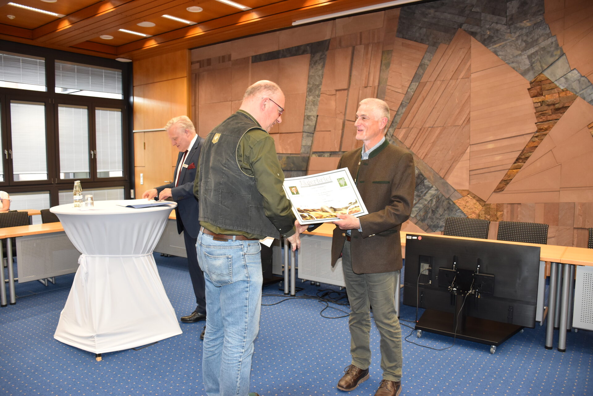 Die Übergabe der Jägerbriefe wurde im Kreishaus gebührend mit Ehren-Fanfaren und einem gemeinsamen Essen gefeiert. Landrat Wolfgang Spelthahn und Andreas Dering, Vorsitzender der Kreisjägerschaft Düren e.V., überreichten den neuen Jägerinnen und Jägern ihre Jägerbriefe, die ihnen nun als Voraussetzung für einen Jagdschein dienen. Dieser wird nach intensiver Prüfung von der Unteren Jagdbehörde des Kreises Düren ausgestellt.