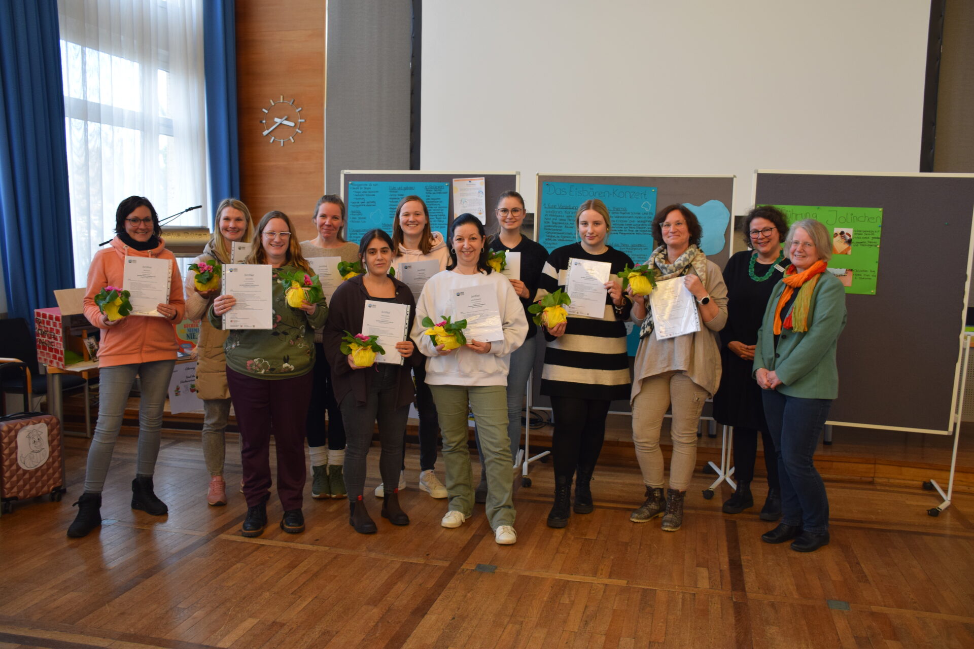 Wie erkenne ich eine Sprachstörung? Welche Spiele, Lieder und Materialien eignen sich besonders gut zum Erlernen der Sprache? Mit diesen und anderen Fragen haben sich Kita-Fachkräfte des 19. Durchlaufs der Fortbildungsreihe "Sprachliche Bildung im Elementarbereich" beschäftigt. Dreizehn von ihnen schlossen die vom Kommunalen Integrationszentrum angebotene Reihe nun mit einem Zertifikat ab.
