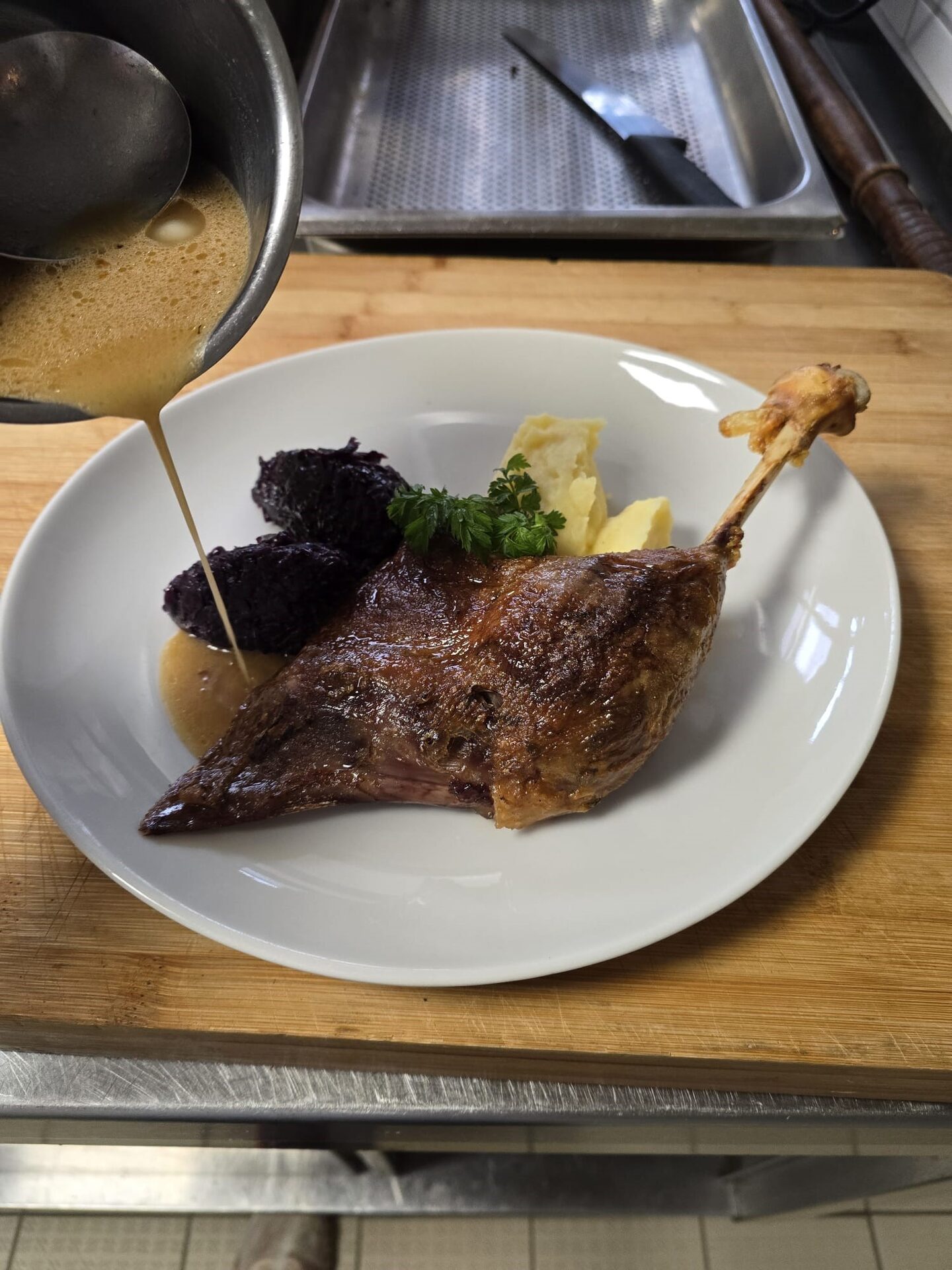 Das Gemüse mit dem Rotwein ablöschen und diesen komplett reduzieren. Die Keulen nun wieder in den Bräter legen. Den Bräter mit Gänsebrühe oder Gemüsebrühe auffüllen, sodass die Gänsekeulen etwa 3 cm mit Wasser bedeckt sind.